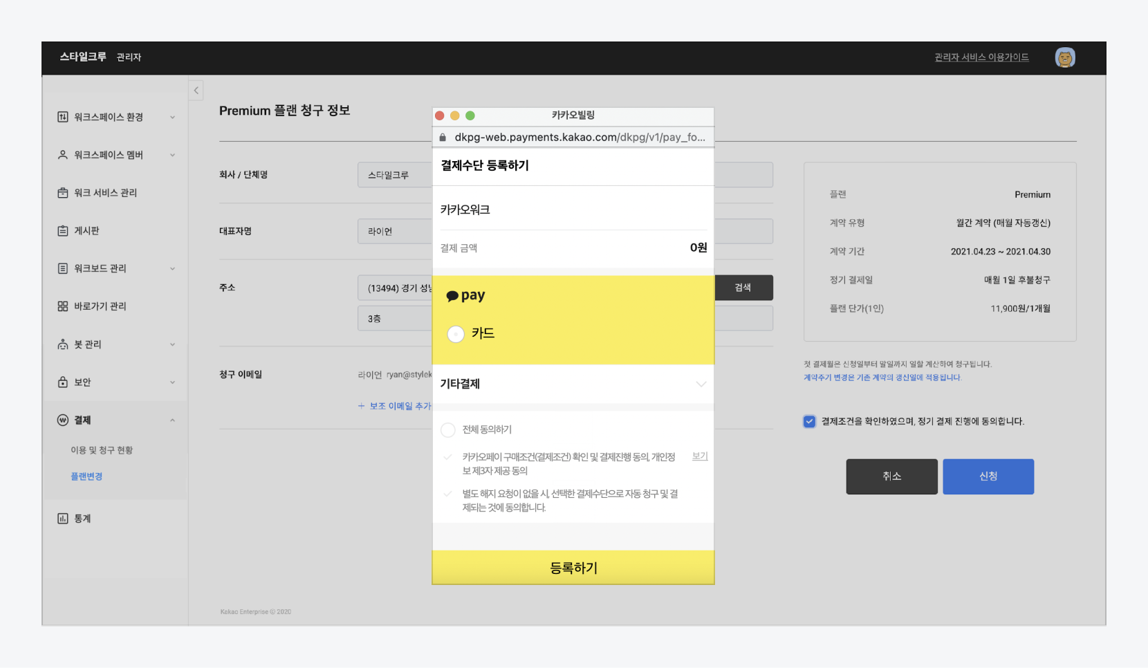 ![결제 수단 변경](https://t1.kakaocdn.net/service_kep_docpublish/git/kakaowork/admin/%EA%B2%B0%EC%A0%9C%20%EC%88%98%EB%8B%A8%20%EB%B3%80%EA%B2%BD.png)