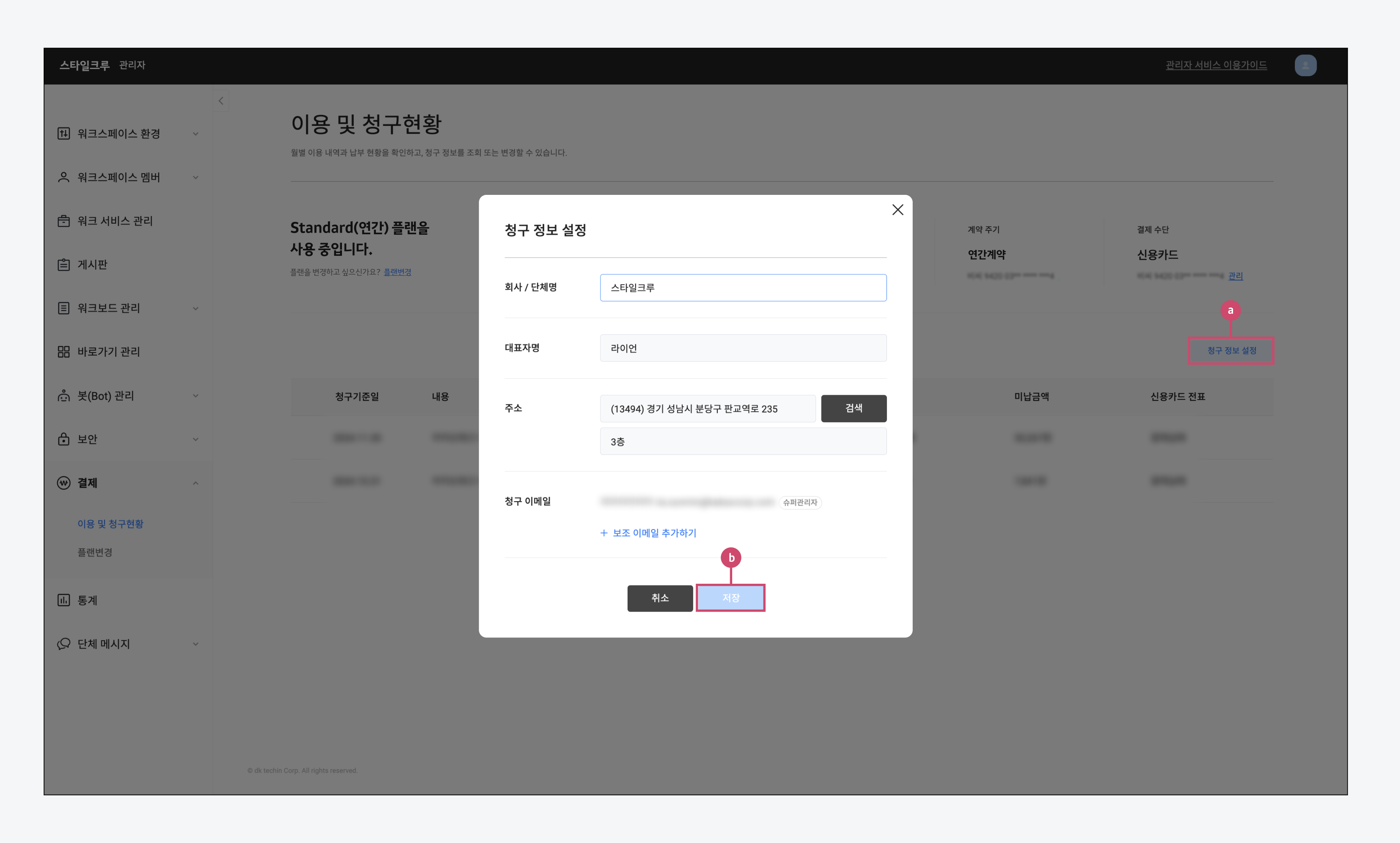 b. 청구 정보를 수정 및 설정하고 \[저장] 버튼을 클릭하면 설정이 완료됩니다.