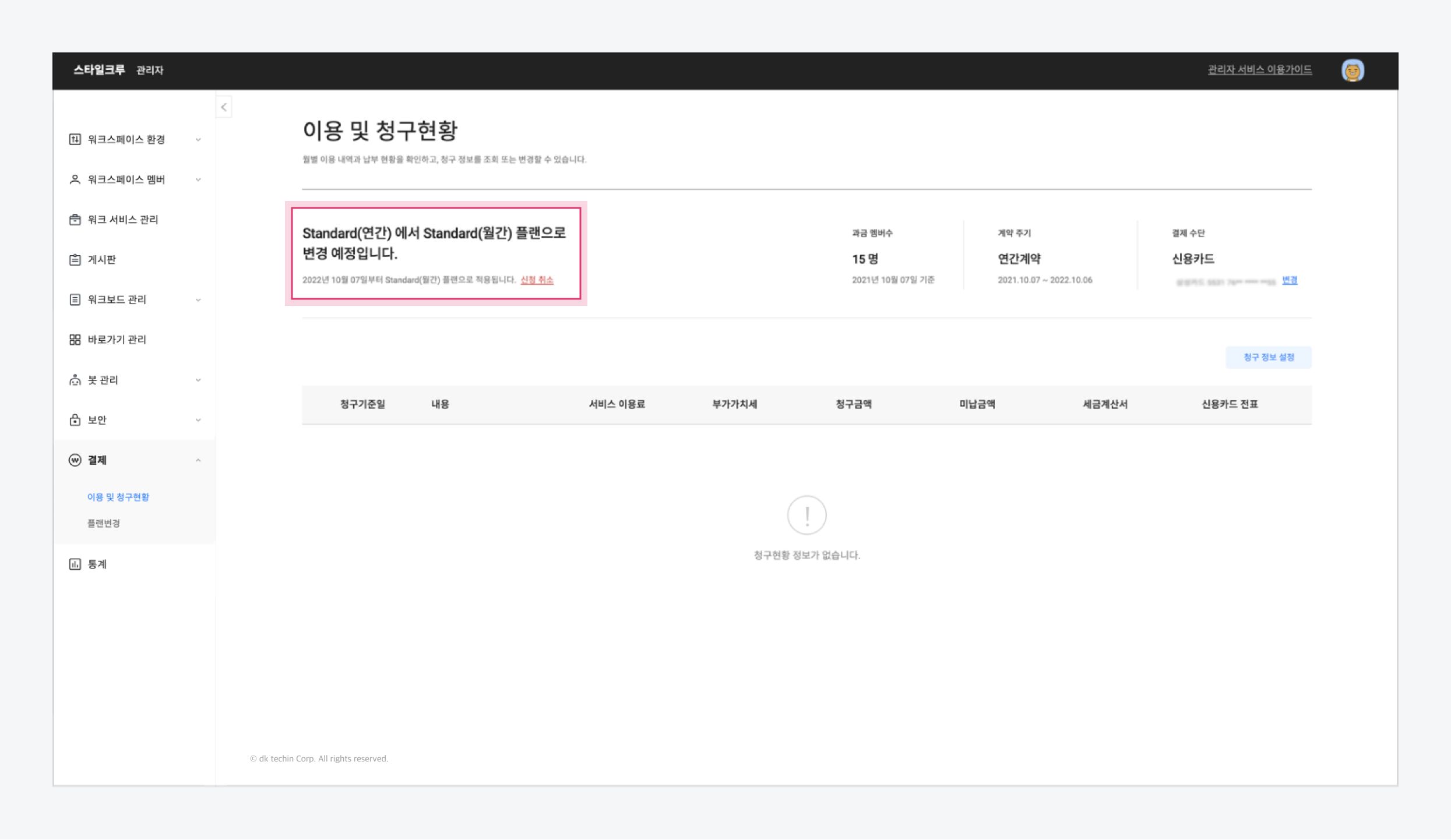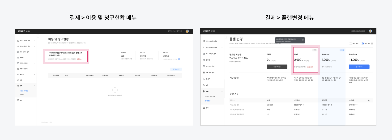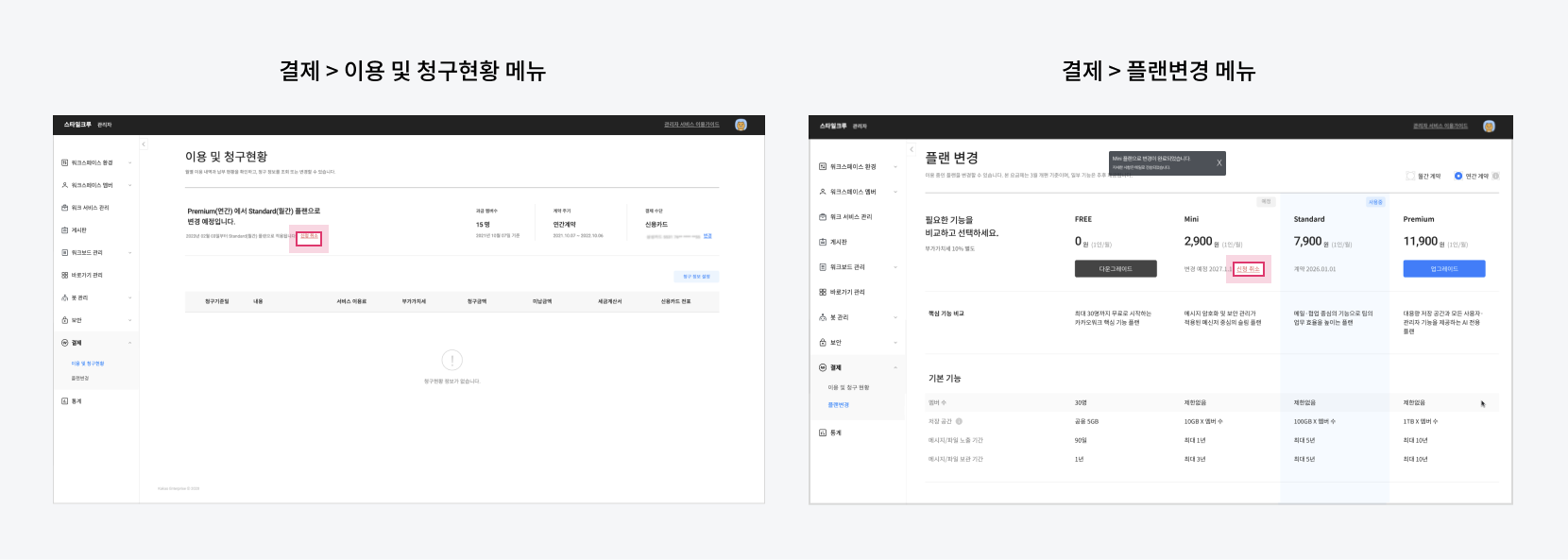 2. **결제 > 이용 및 청구현황** 또는 **결제 > 플랜 변경** 메뉴에서 변경된 플랜을 확인할 수 있습니다.