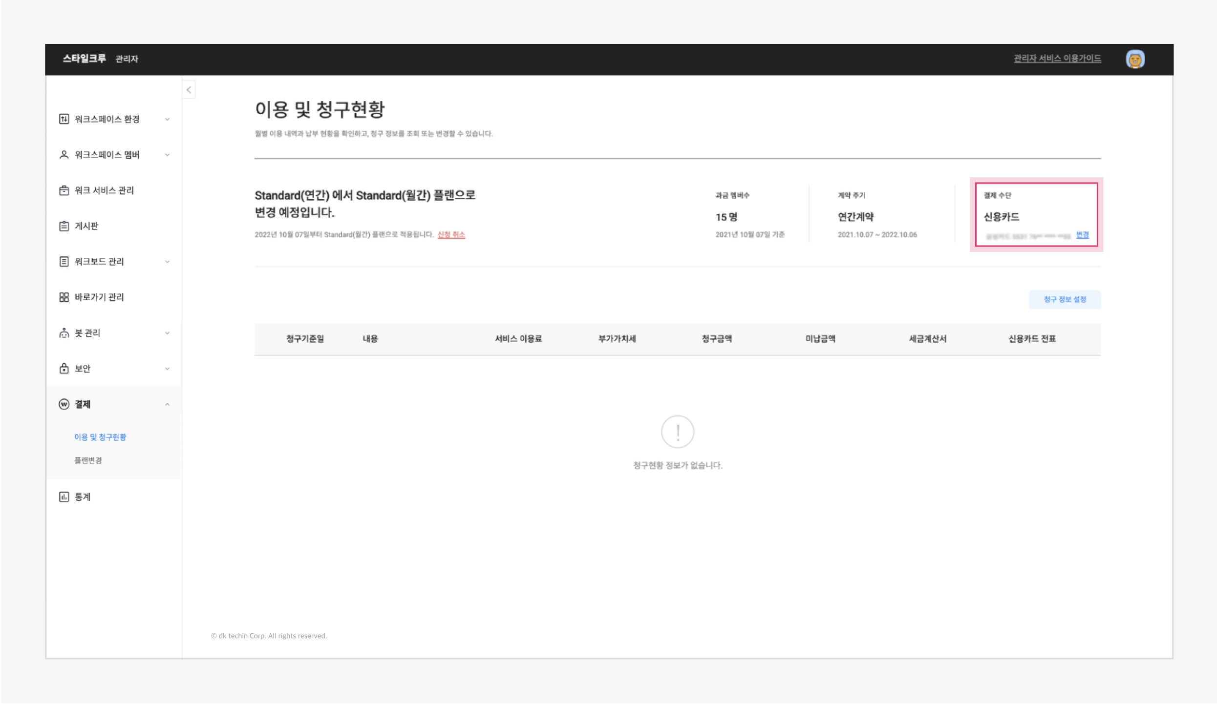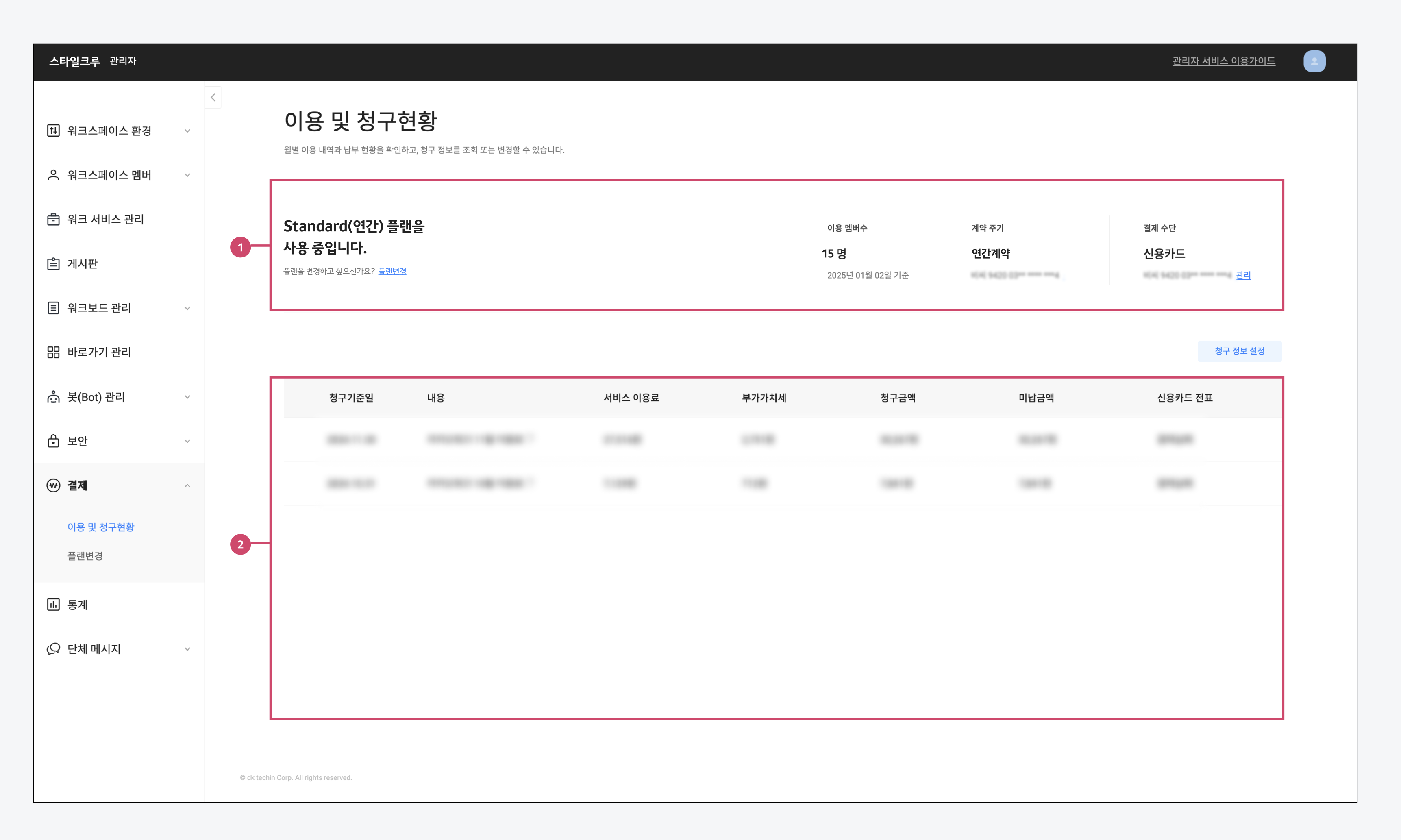 <table><thead><tr><th width="175">구분</th><th>설명</th></tr></thead><tbody><tr><td>⓵ 계약 정보</td><td>현재 이용 중인 플랜 및 계약/결제정보 확인 및 변경<br>- <strong>이용 플랜</strong> : 현재 이용 중인 카카오워크 플랜 ( <a href="https://www.kakaowork.com/pricing">카카오워크 요금 안내</a> 참고 )<br>- <strong>과금 멤버수</strong>: 해당 워크스페이스의 과금 대상 멤버 수(전일 기준 집계)<br>  ㄴ FREE 플랜 이용 시, [이용 멤버 수]로 표시<br>- <strong>계약 주기</strong>: 현재 이용 중인 플랜 계약 상태<br>- <strong>결제 수단</strong>: 워크스페이스 계약에 이용 중인 결제 수단</td></tr><tr><td>⓶ 청구 현황 정보</td><td>월별 청구 상세 내역 및 청구 근거 조회<br>- <strong>청구기준일</strong>: 청구 대상이 되는 사용기간의 말일(매월 말일)<br>- <strong>내용</strong>: 청구 내역<br>- <strong>서비스 이용료</strong>: 카카오워크 서비스 이용 요금(과금 멤버 수 × 이용 플랜 단가)<br>  ㄴ 계약기간 중 멤버 추가 시, 추가일부터 멤버 이용 요금 부과<br>  ㄴ 계약기간 중 멤버 삭제 시, 삭제일부터 멤버 이용 요금 비과금 처리<br>- <strong>부가가치세</strong>: 서비스 이용료 × 10%(원단위 이하 절사)<br>- <strong>청구금액</strong>: 해당 월에 발생한 요금 총액<br>- <strong>미납금액</strong>: 조회시점 기준 결제가 완료되지 않은 금액<br>- <strong>신용카드 전표</strong>: 신용카드 결제 상태 확인 및 열람</td></tr></tbody></table>