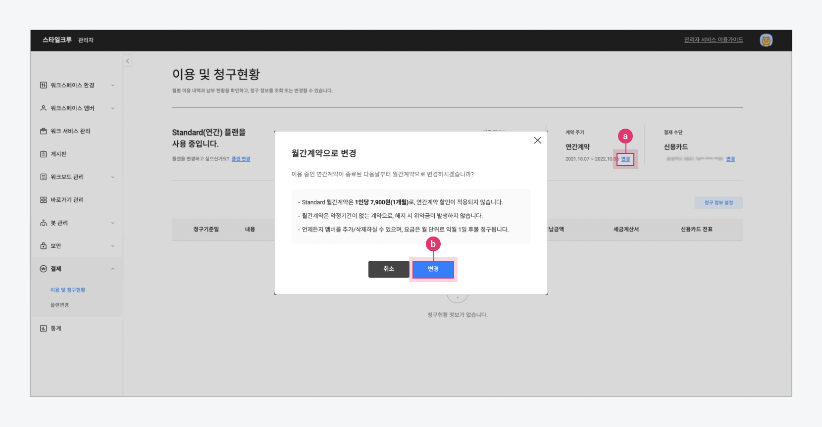 1. **결제 > 이용 및 청구현황** 메뉴에서 계약 주기를 **연간계약**/**월간계약**으로 변경할 수 있습니다.