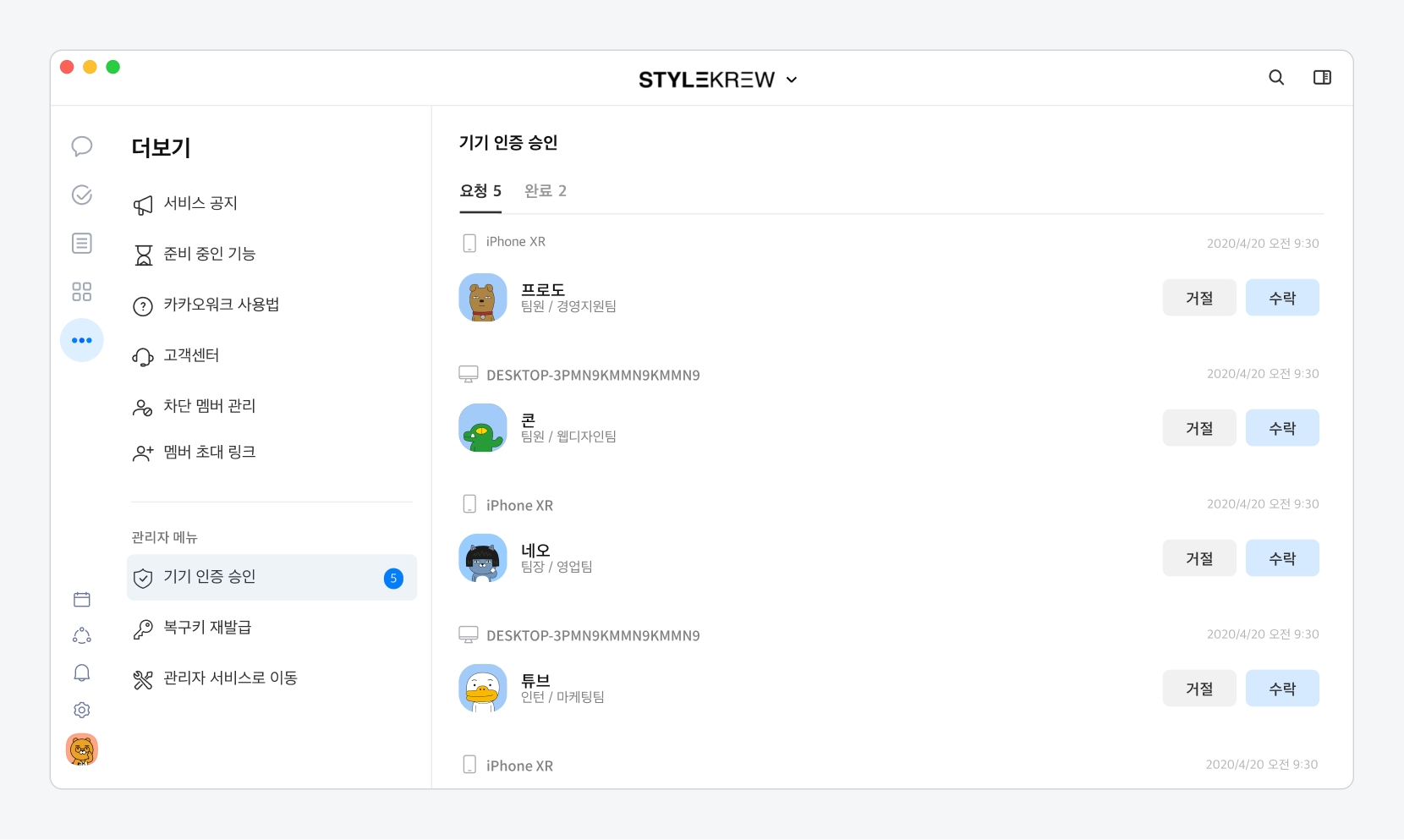 여러 멤버가 기기 인증 승인을 요청한 경우 일괄적으로 승인 또는 거절을 처리할 수 있습니다. 더보기 탭 > 관리자 > 기기 인증 승인 메뉴 > 요청 탭으로 이동해 [수락] 또는 [거절] 버튼을 클릭합니다.
