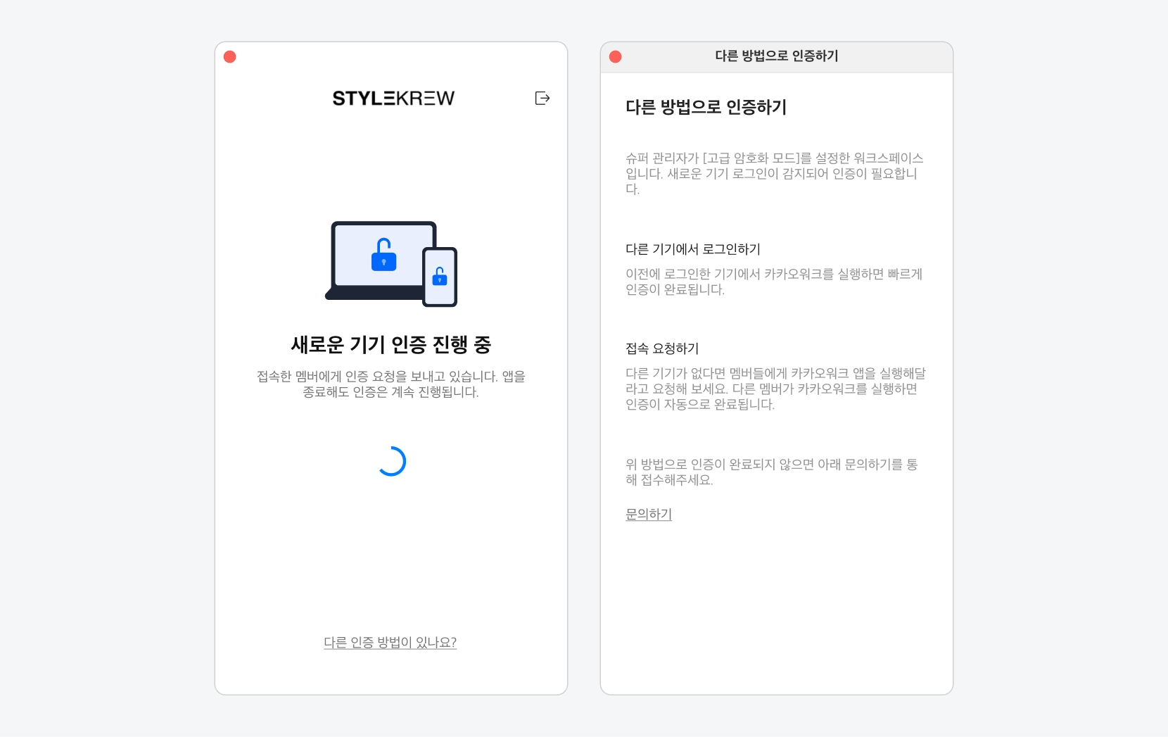 2022년 12월 업데이트 이전 버전의 카카오워크에서는 새로운 기기에서 카카오워크에 로그인할 때 모든 멤버는 기존에 로그인된 기기에서 인증을 진행해야 합니다.