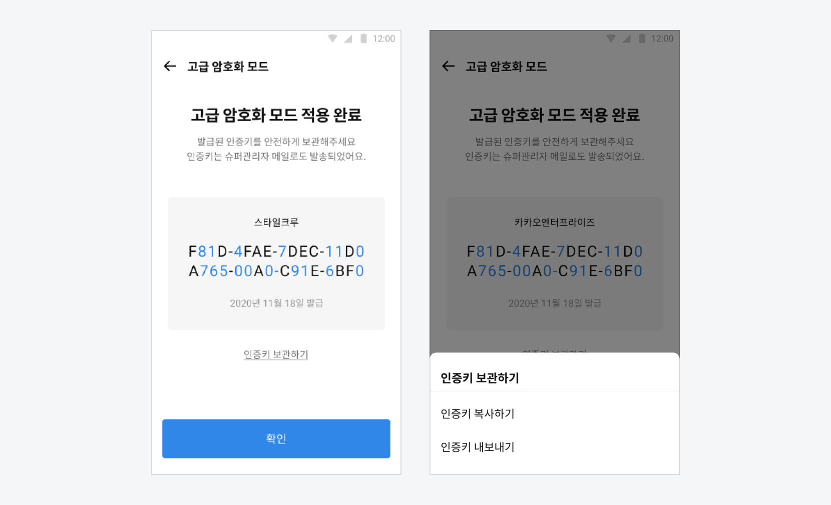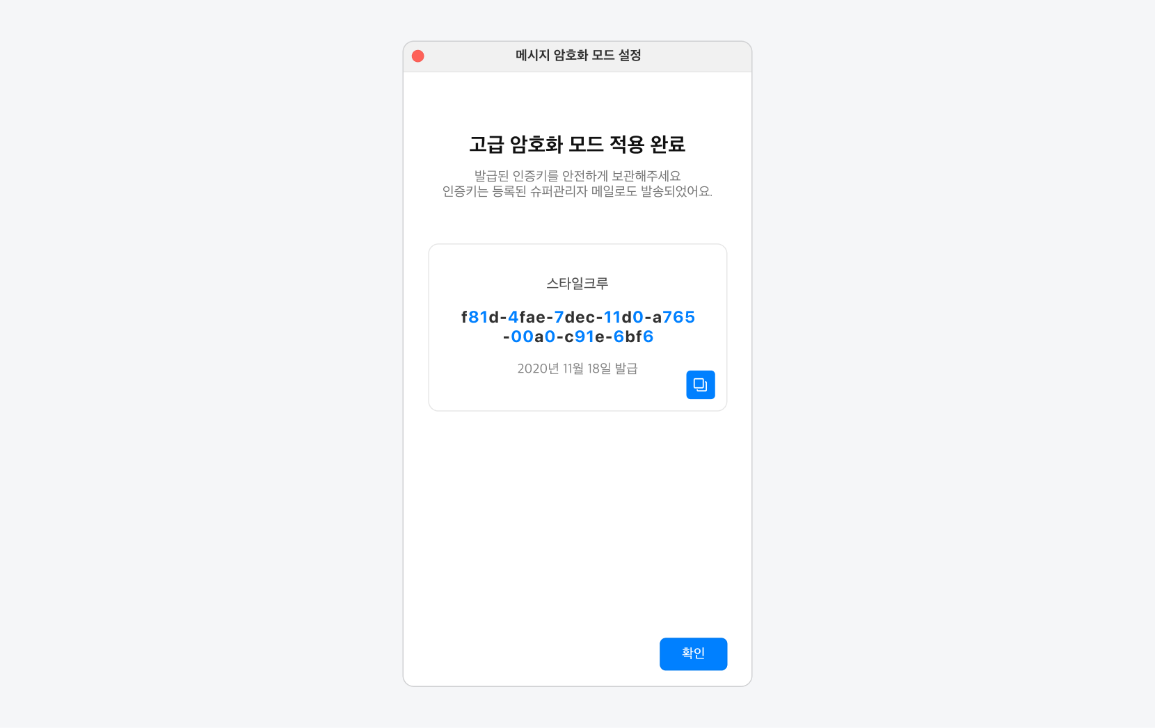 고급 암호화 모드에서 모든 멤버는 새로운 기기로 로그인 시 기기 인증 절차를 거치게 됩니다. 슈퍼 관리자는 자동 인증 이외에도 인증키를 활용해 기기 인증을 수행할 수 있습니다. 인증키는 고급 암호화 모드로 변경 시 슈퍼 관리자에게 발급됩니다.