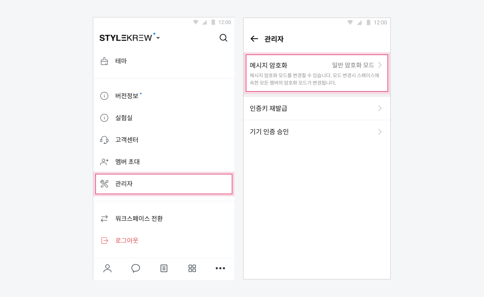 카카오워크 메시지 암호화 모드는 총 2가지가 제공됩니다.