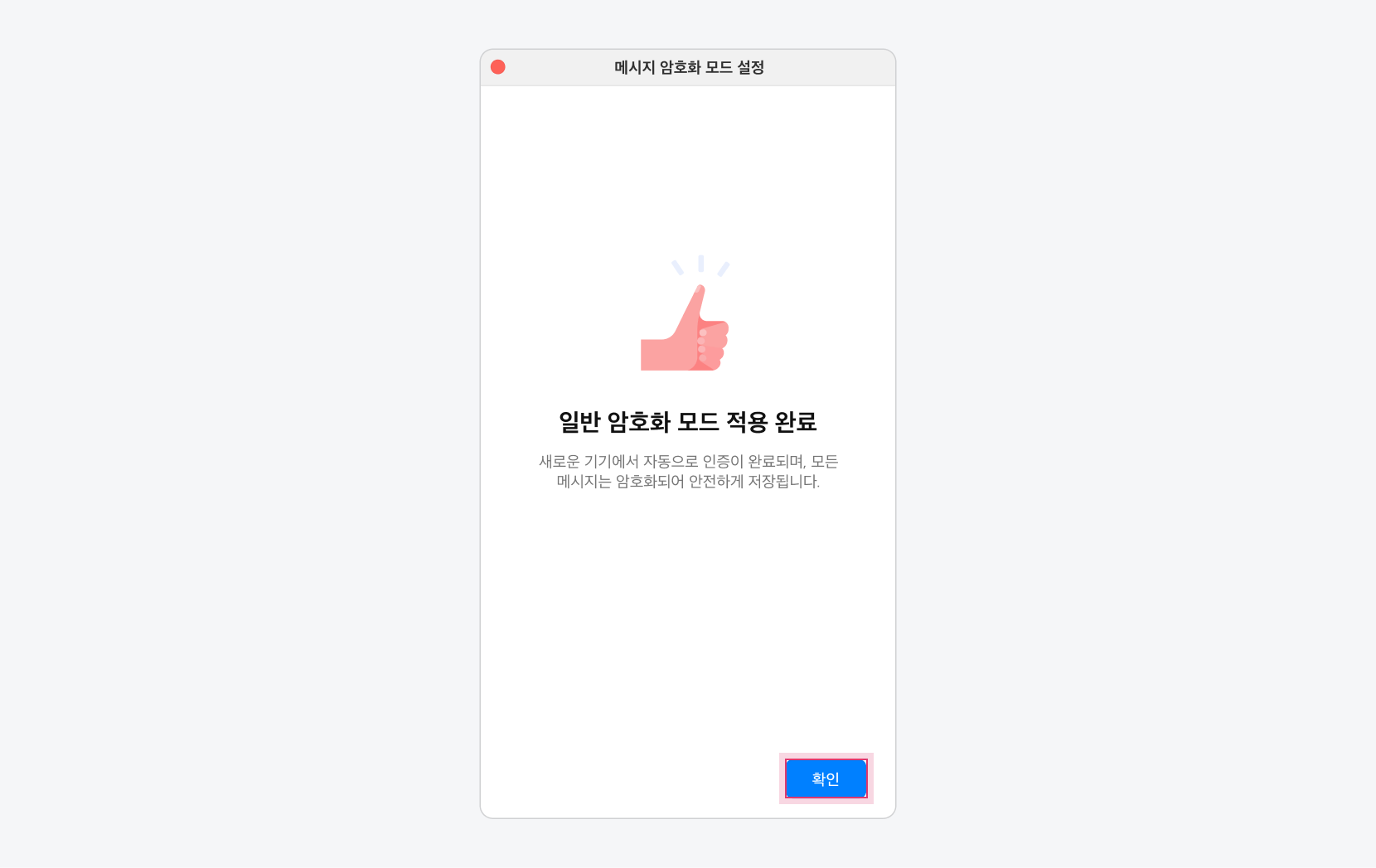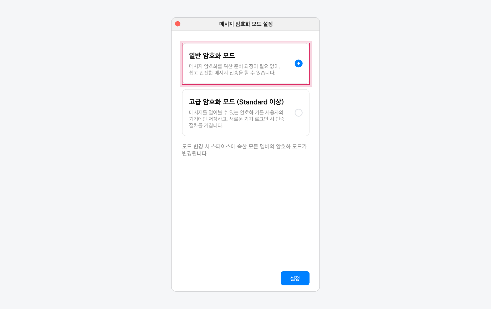 고급 암호화 모드에서 일반 암호화 모드로 변경할 수 있습니다. 일반 암호화 모드에서는 새로운 기기에서 로그인 시 추가 인증 과정이 생략되어, 간편하게 워크스페이스에 로그인할 수 있습니다.