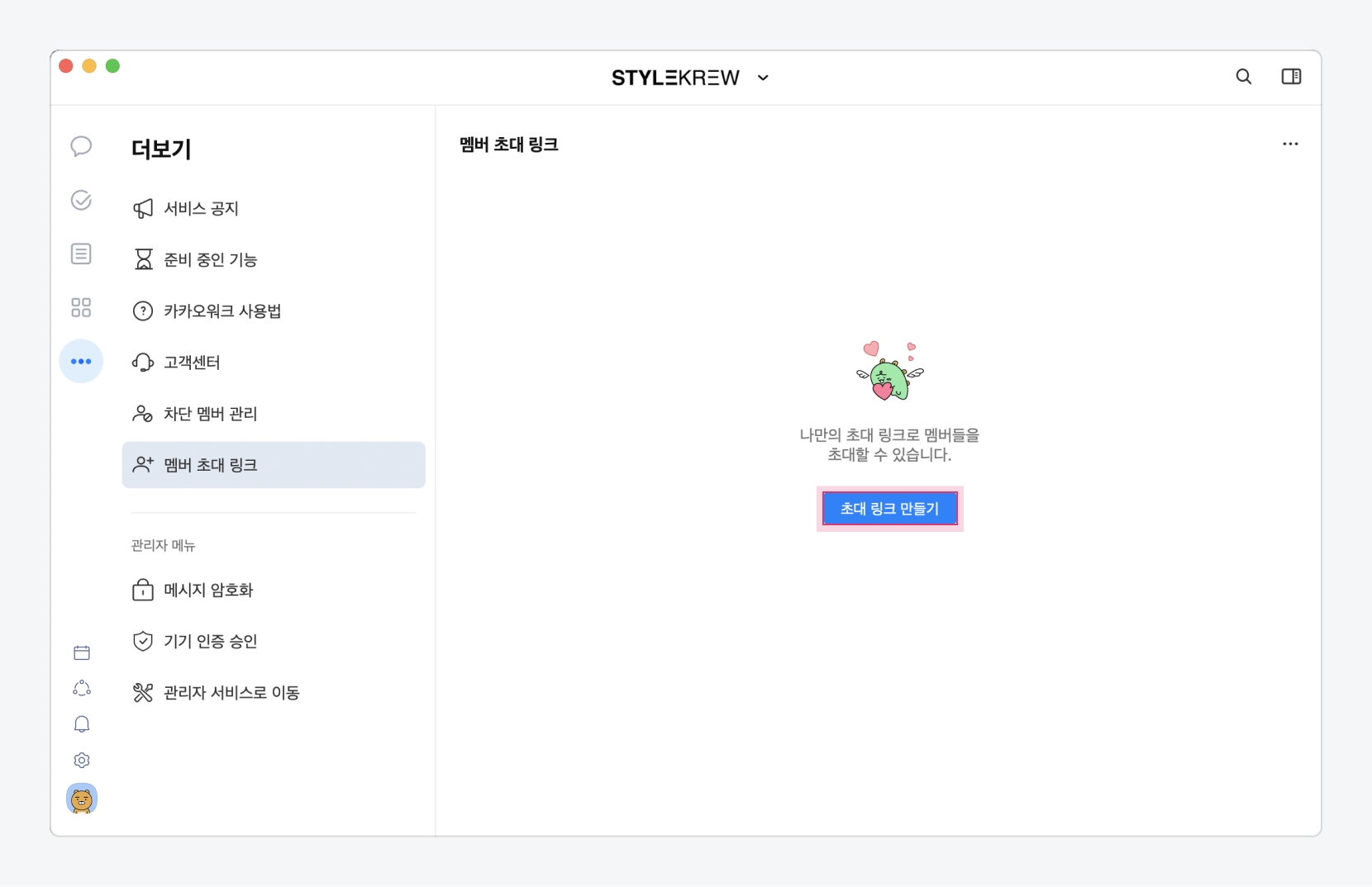 더보기 탭 > 멤버 초대 링크에서 [초대링크 만들기] 버튼을 클릭합니다.