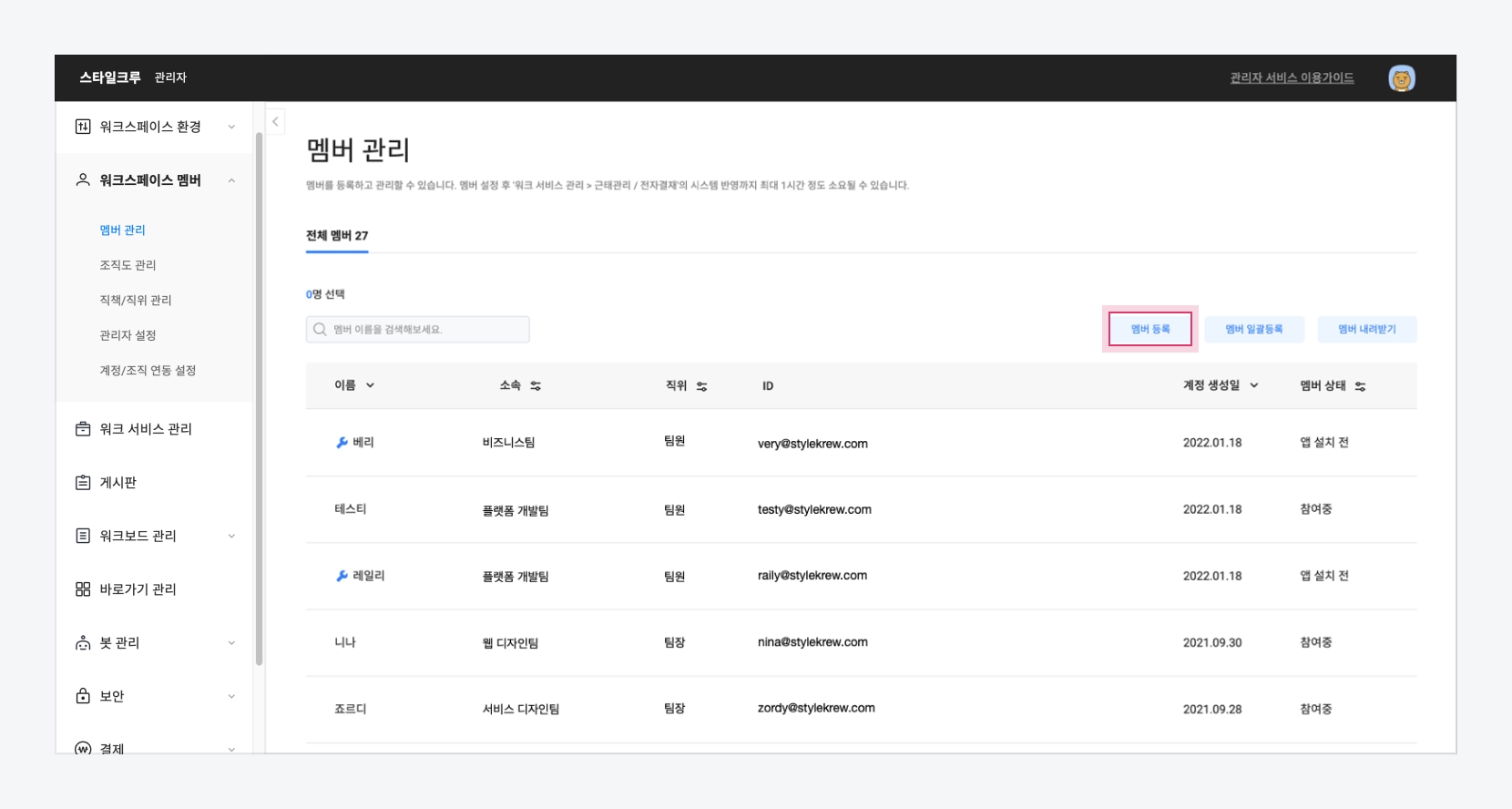 멤버를 등록하면 멤버의 ID(이메일 주소)로 멤버 등록 이메일이 발송됩니다.