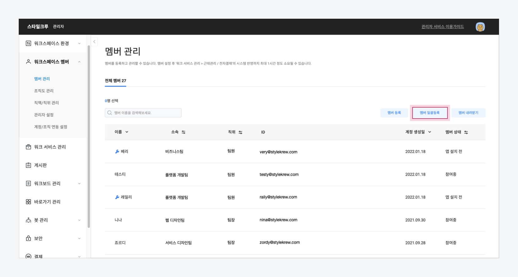 초대 링크를 통해 멤버를 초대하는 방법 외에, 슈퍼 관리자/관리자는 카카오워크 관리자 서비스(https://admin.kakaowork.com/)에 접속하여 워크스페이스에 초대할 멤버를 직접 등록할 수 있습니다. 이 경우, 멤버들은 슈퍼 관리자/관리자가 전송한 이메일 초대장을 통해 비밀번호 설정한 후 계정 등록을 완료할 수 있습니다.