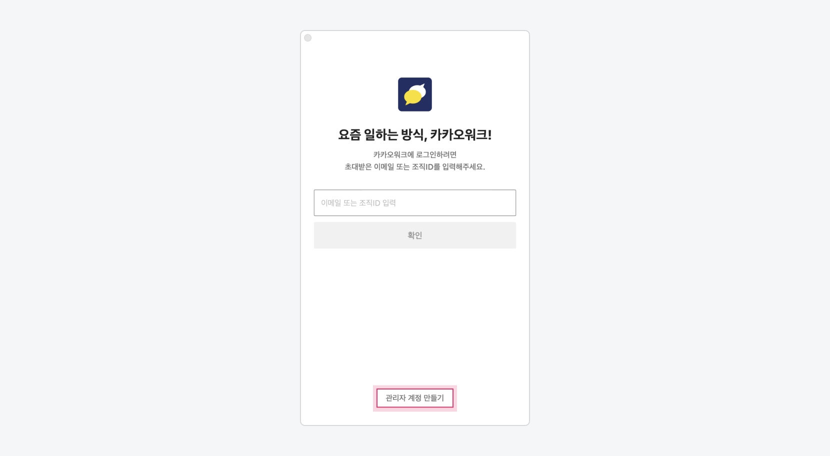 주의 워크스페이스 생성 및 관리자 계정 가입은 다운로드 받은 카카오워크 앱에서만 가능합니다.