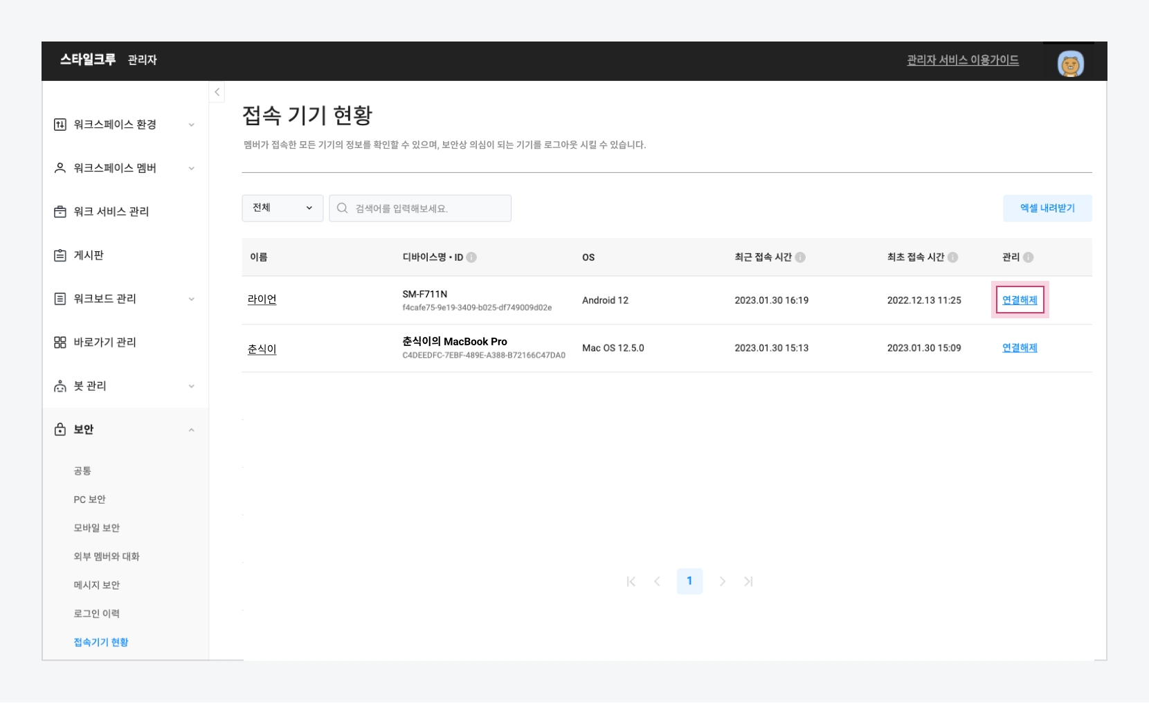카카오워크 관리자 서비스 > 보안 > 접속 기기 현황 메뉴에서 접속 기기 목록을 확인합니다.