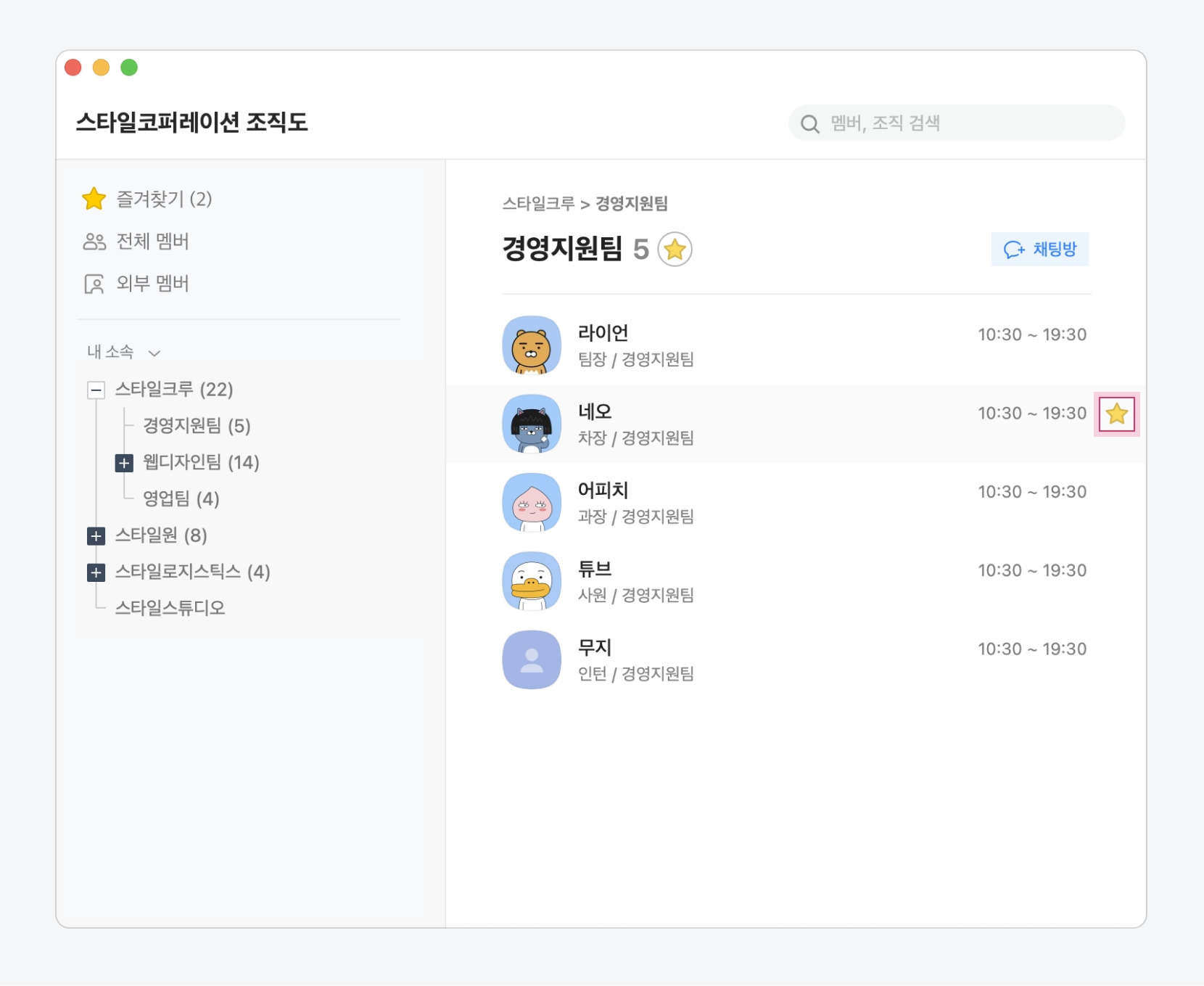 자주 대화하는 멤버나 조직을 즐겨찾기에 등록해 다이내믹 패널에서 프로필을 간편하게 조회하고 대화를 빠르게 시작할 수 있습니다.