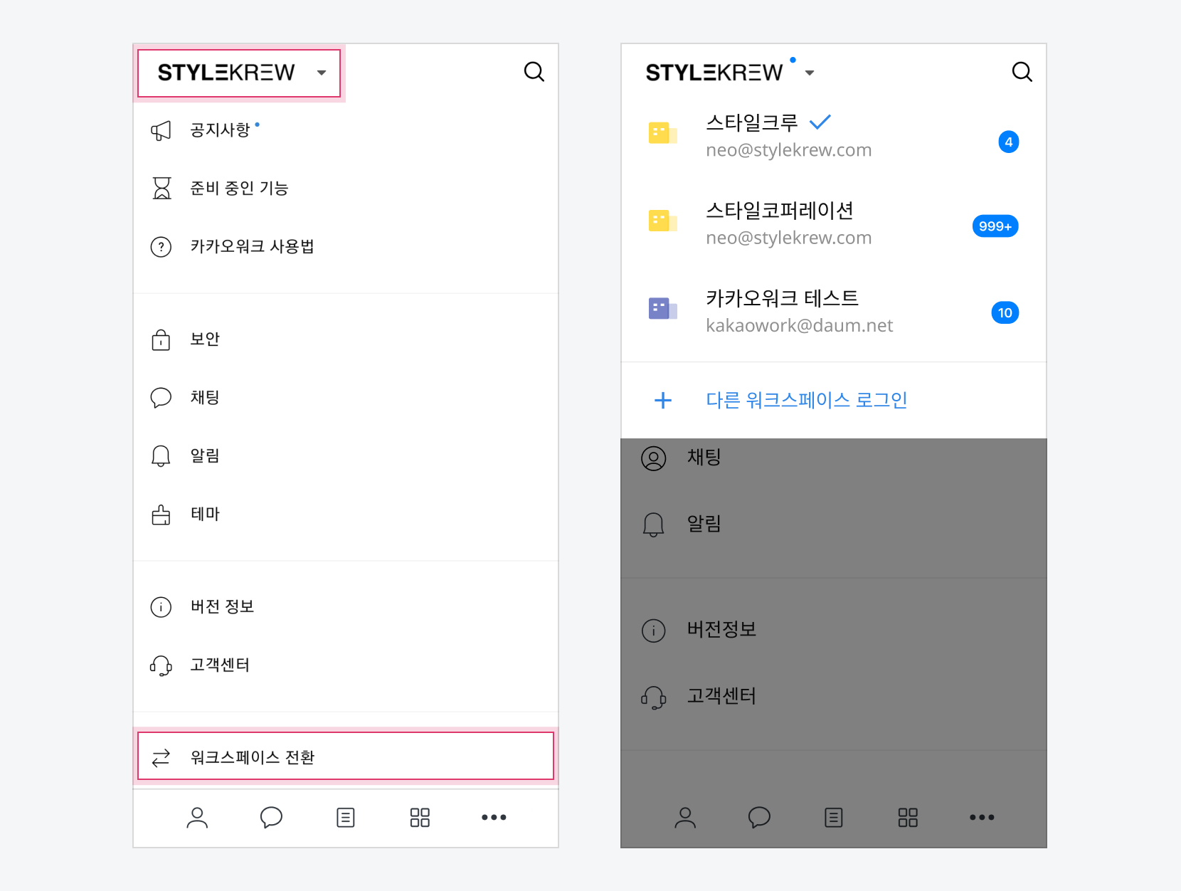 1. 워크스페이스 로고 또는 **더보기** 탭 > **워크스페이스 전환** 메뉴를 선택합니다.