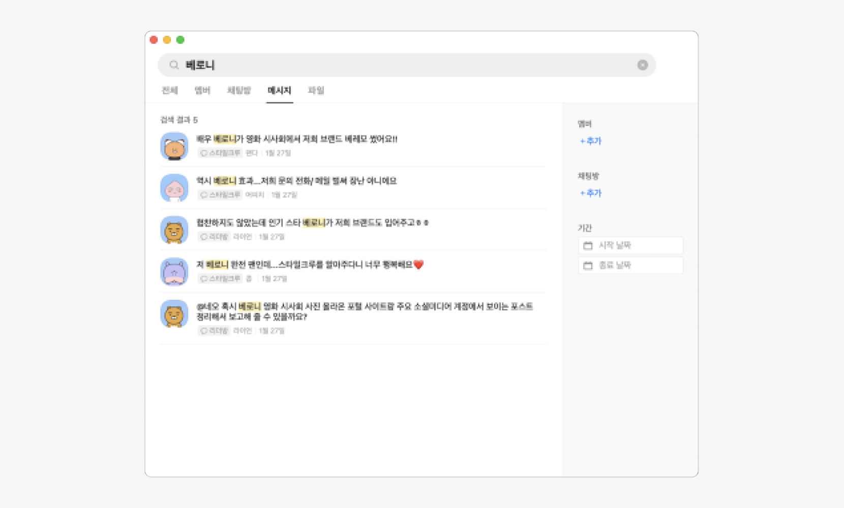 필터 기능을 활용하여 멤버/채팅방/기간별로 특정 메시지를 검색할 수 있습니다.