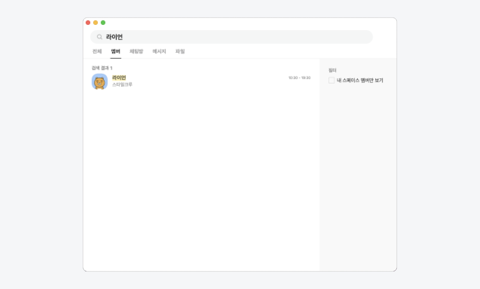 검색 옵션 > 내 스페이스 멤버만 보기에 체크 시, 해당 스페이스에 포함된 멤버만 표시됩니다.