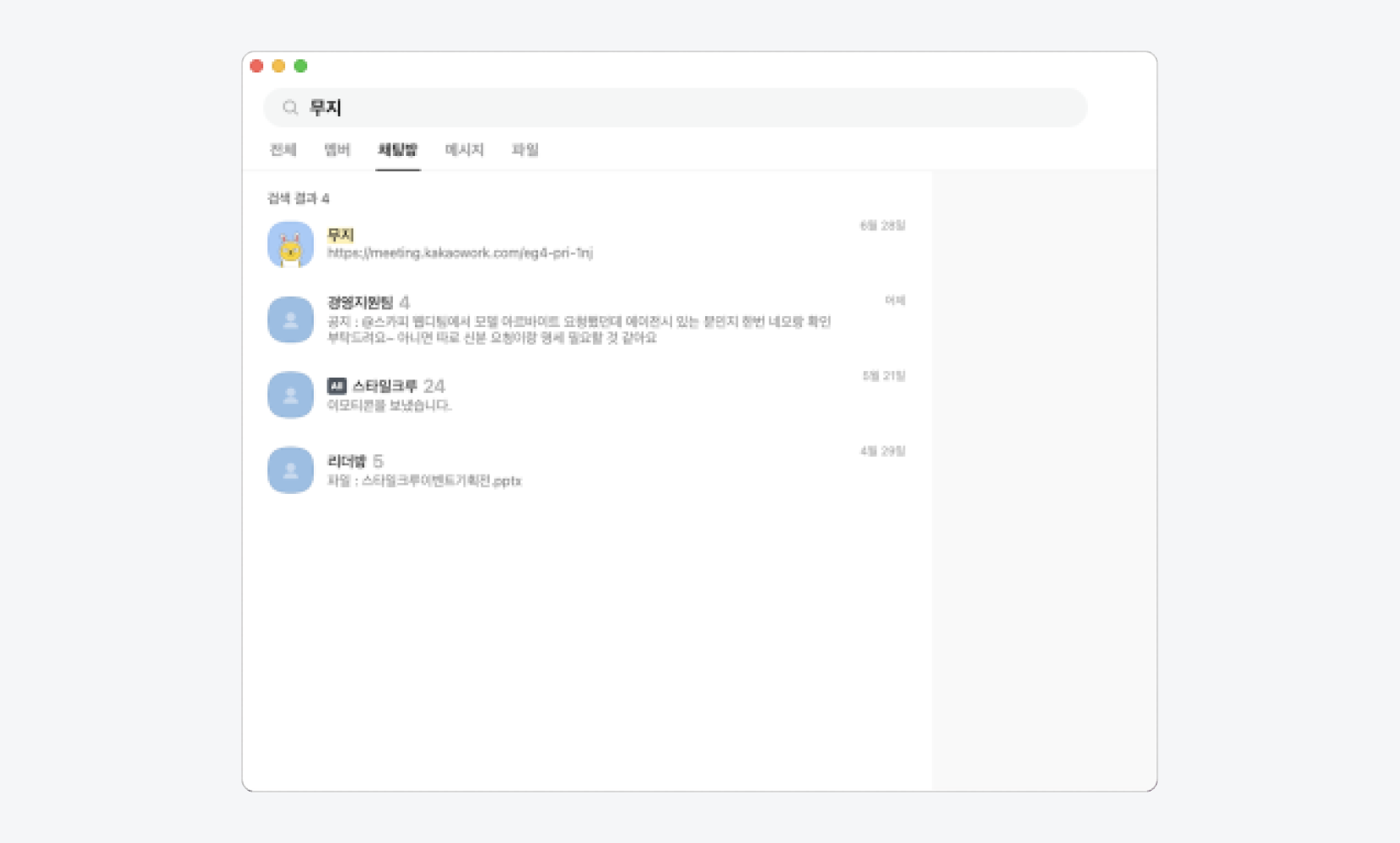 전체 탭에서는 멤버/조직, 채팅방, 메시지, 파일에 대한 검색 결과를 한번에 볼 수 있습니다. 이때 사용자와 관련도가 높은 멤버들이 상위에 표시됩니다.