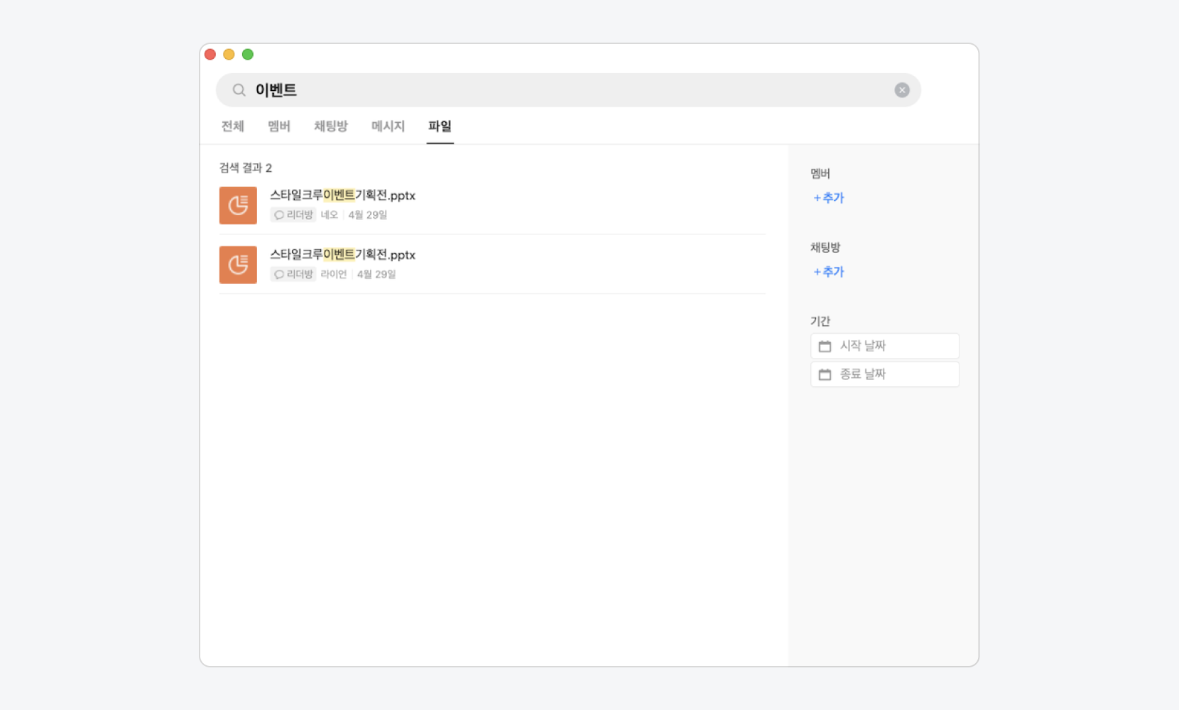필터 기능을 활용하여 멤버/채팅방/기간별로 특정 파일을 검색할 수 있습니다.