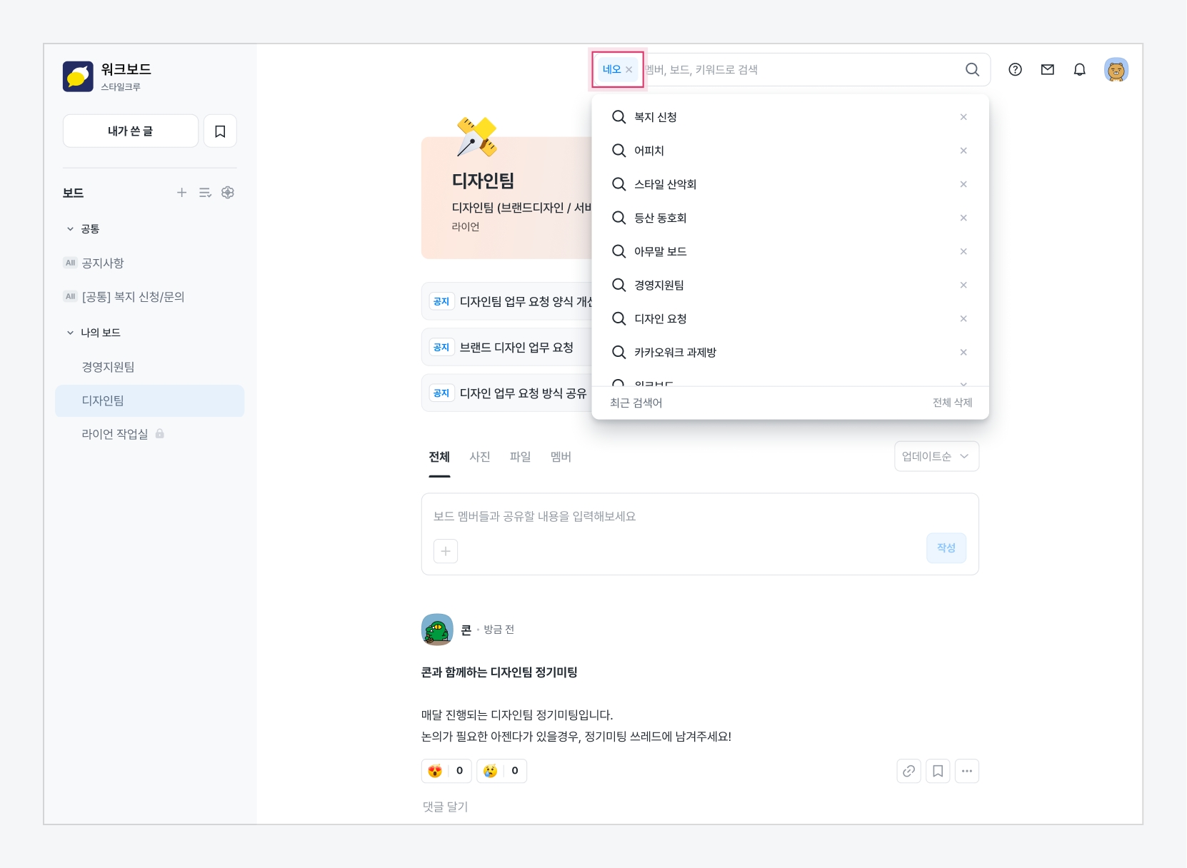 워크보드 홈 화면 검색창에 키워드를 입력하여 보드, 멤버, 게시글을 빠르게 찾을 수 있습니다.