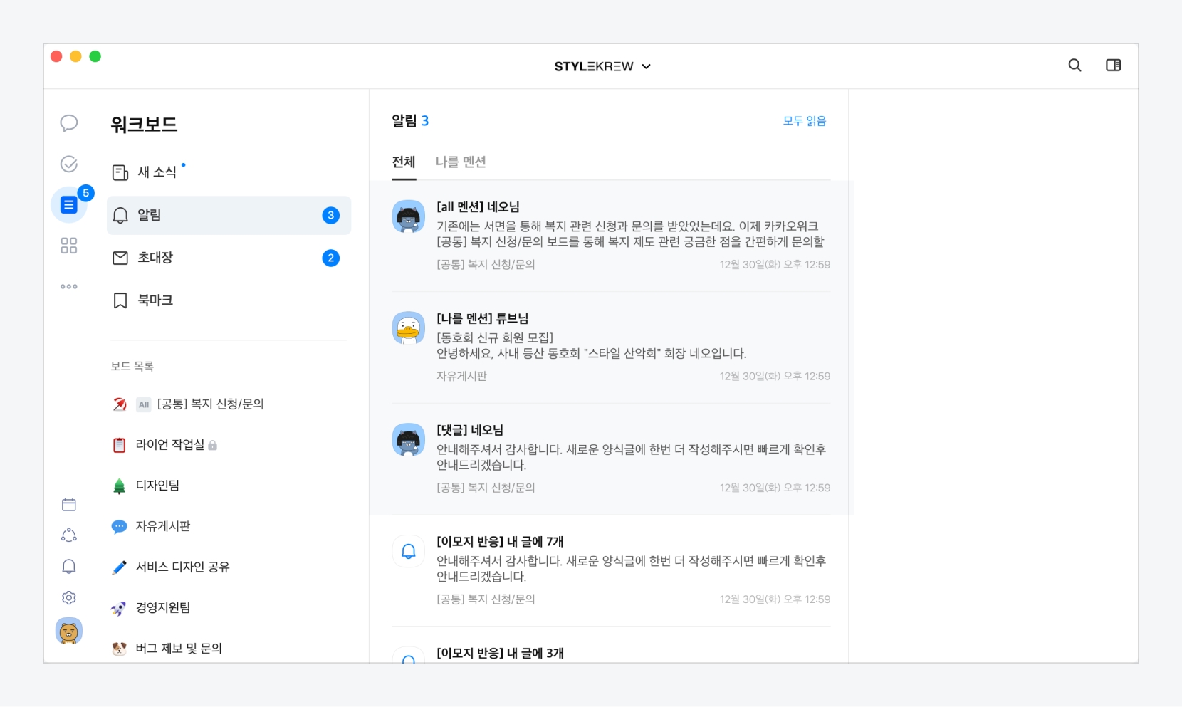 알림센터에서 나와 관련한 워크보드의 알림 내역을 확인할 수 있습니다. 읽지 않은 알림의 개수만큼 숫자 배지가 표시됩니다. 모두 읽음 혹은 모두 읽기을 선택하면 모든 알림이 읽음 처리되고 숫자 배지가 사라집니다.