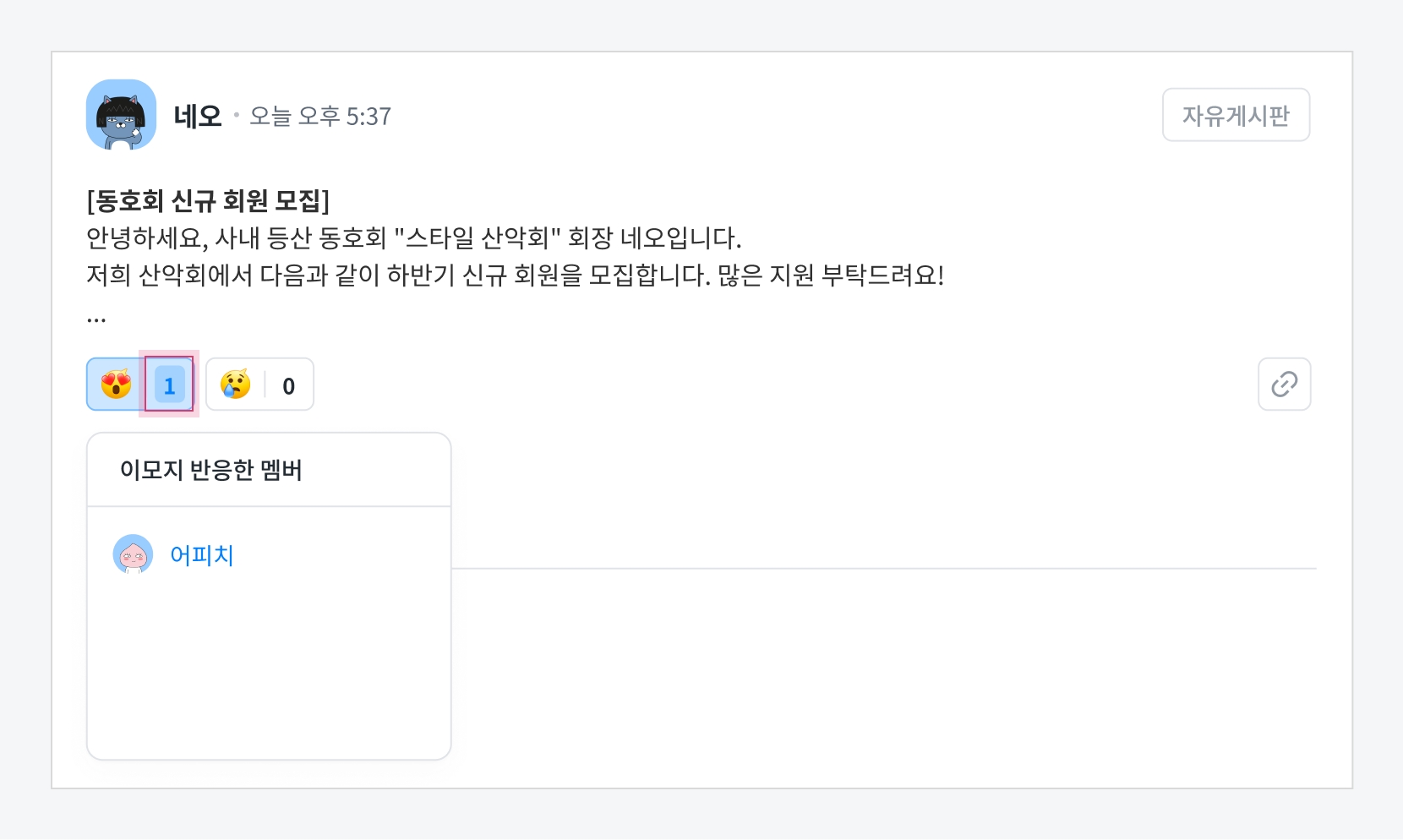 이모지 반응은 이모지(Emoji)를 사용하여 게시글 및 댓글에 쉽고 빠르게 응답할 수 있는 기능입니다.