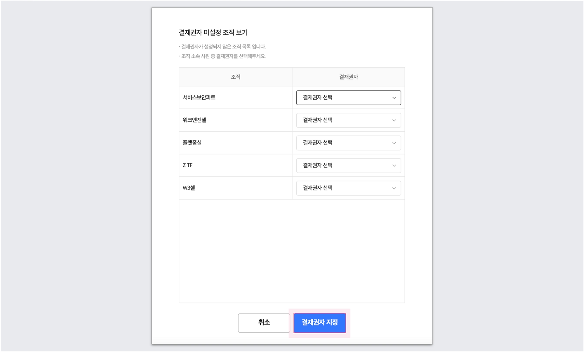 결재권자 미설정 조직 보기 팝업창에서 조직별 결재권자를 선택하고 [결재권자 지정] 버튼을 클릭합니다.