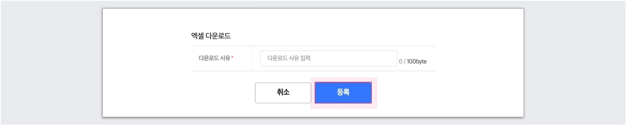 엑셀 다운로드 팝업창이 나타나면, 다운로드 사유를 입력 후 [등록] 버튼을 클릭합니다.