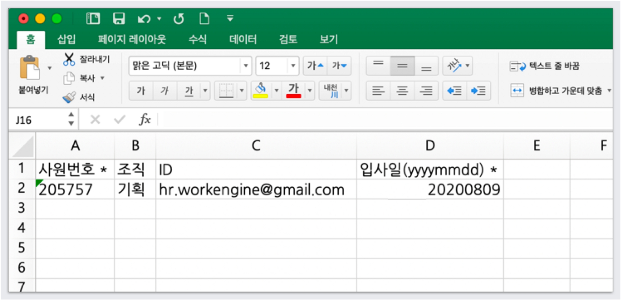 다운로드된 엑셀 파일을 열고, 입사일(yyyymmdd) 칼럼에서 입사일을 입력 후 파일을 저장합니다.