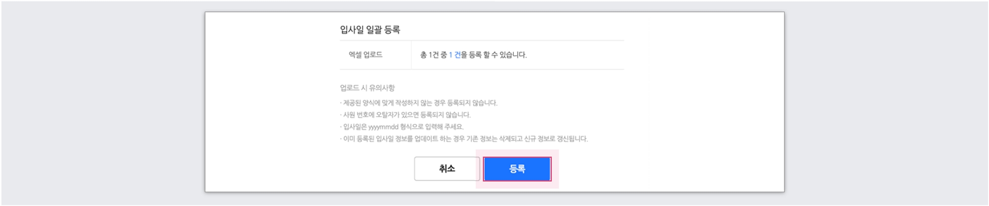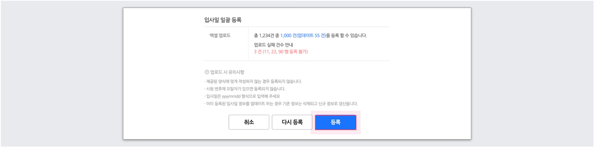 그림. 입사일 일괄 등록 전체 성공시 팝업창 일부 실패했을 때
