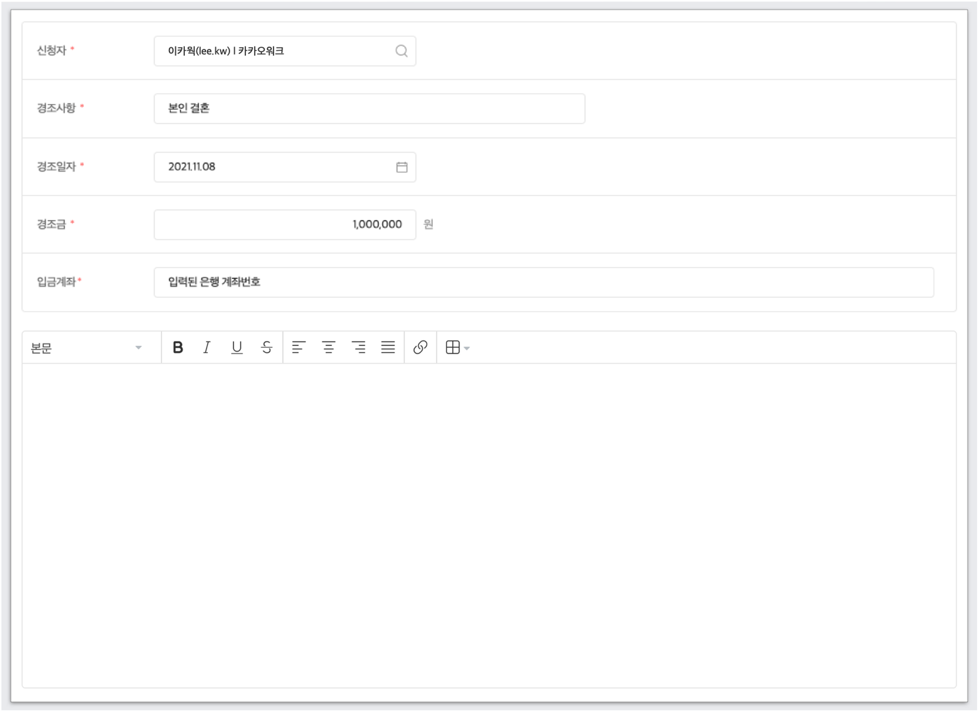 <figure><img src="https://t1.kakaocdn.net/service_kep_docpublish/Figma/[%EA%B7%BC%EA%B2%B0%EC%A1%B0]%20Kakao%20Work/%EC%A0%84%EC%9E%90%EA%B2%B0%EC%9E%AC%EA%B4%80%EB%A6%AC%EC%9E%90_%EA%B2%BD%EC%A1%B0%EA%B8%88%20%EC%8B%A0%EC%B2%AD%EC%84%9C%20%ED%85%9C%ED%94%8C%EB%A6%BF.png" alt=""><figcaption><p>그림. 경조금신청서</p></figcaption></figure>
