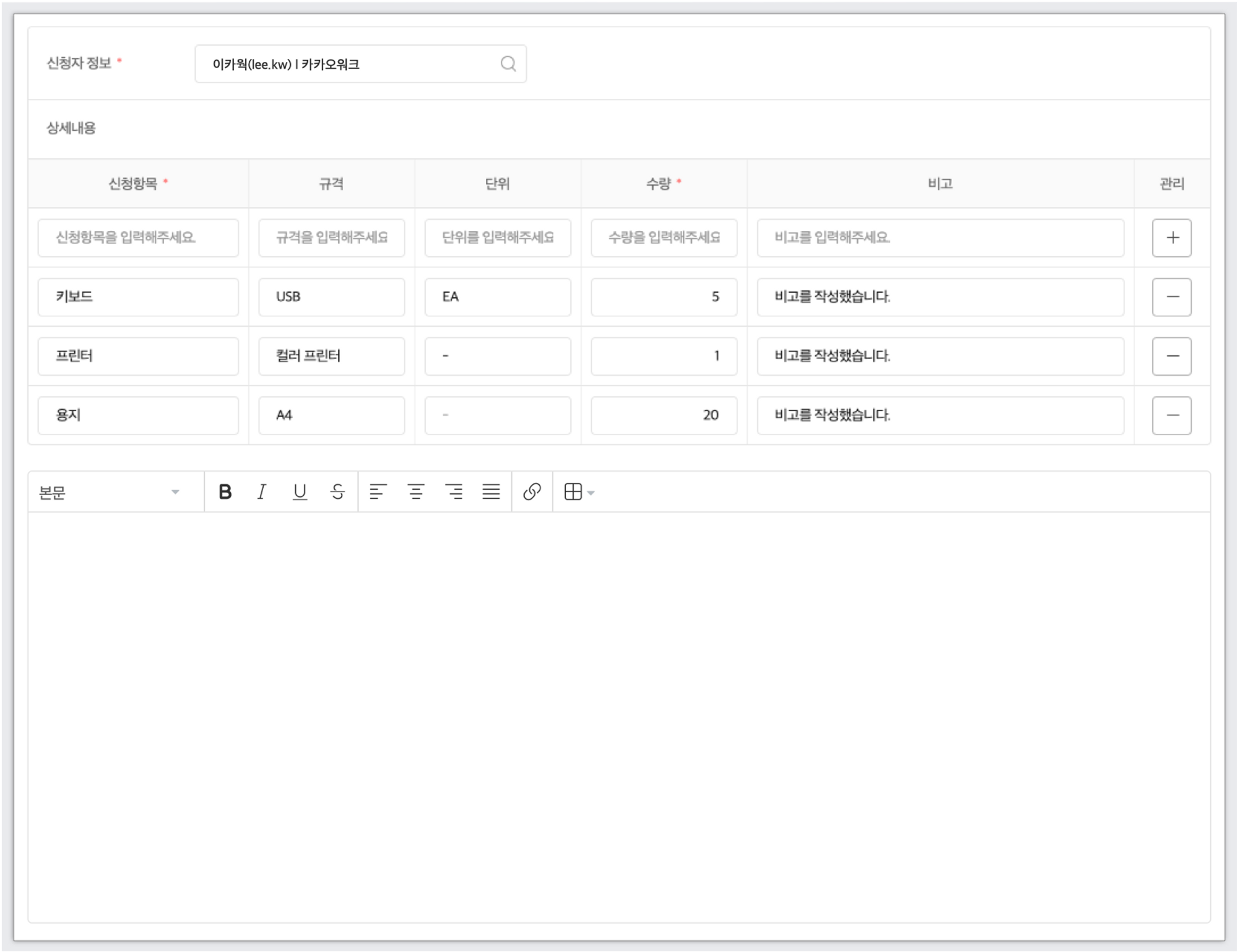 사무용품신청서 관련 폼이 제공되고 하단의 에디터 영역을 사용하여 기안 서식에 사용할 내용을 추가할 수 있습니다.