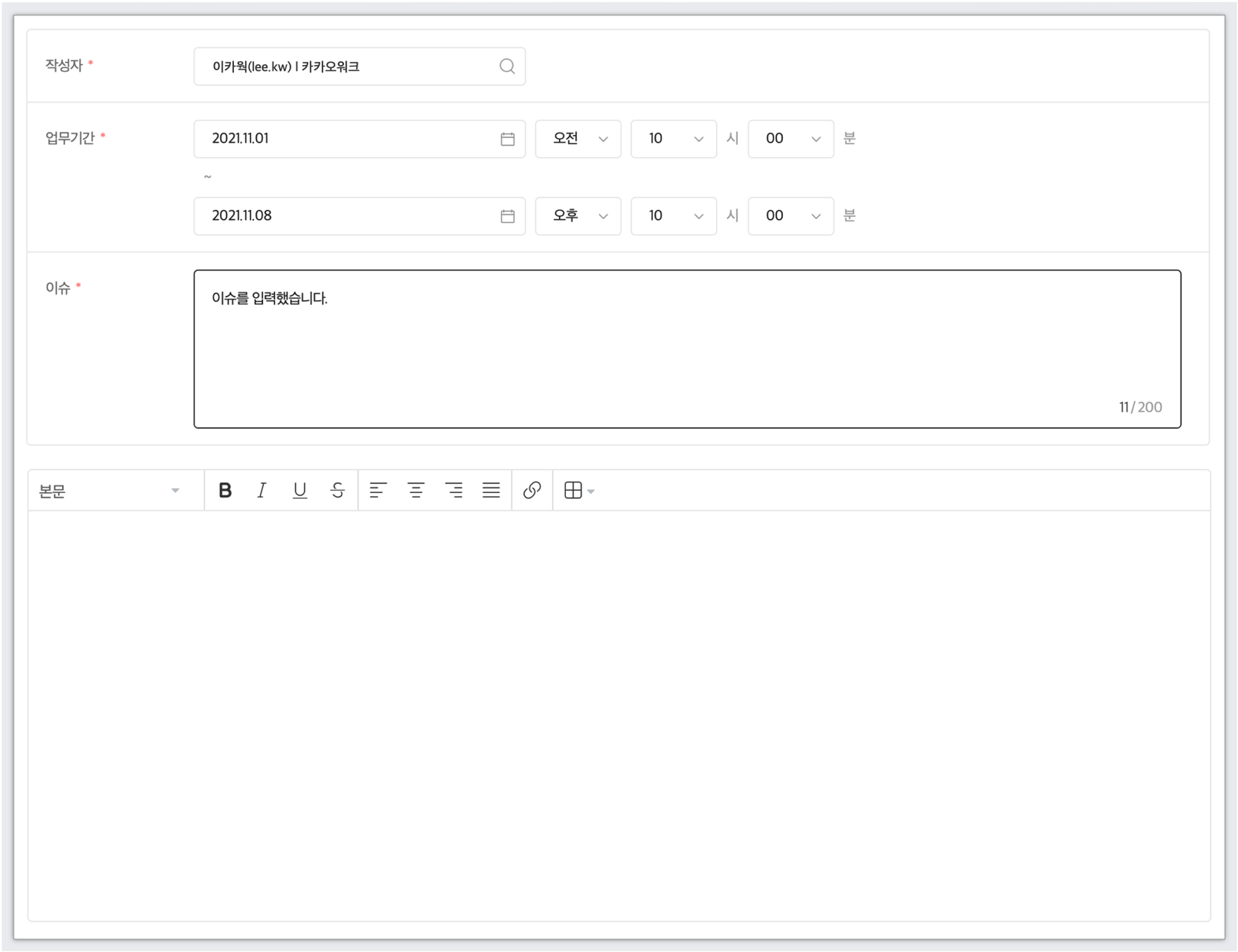 업무보고 관련 폼이 제공되고 하단의 에디터 영역을 사용하여 기안 서식에 사용할 내용을 추가할 수 있습니다.
