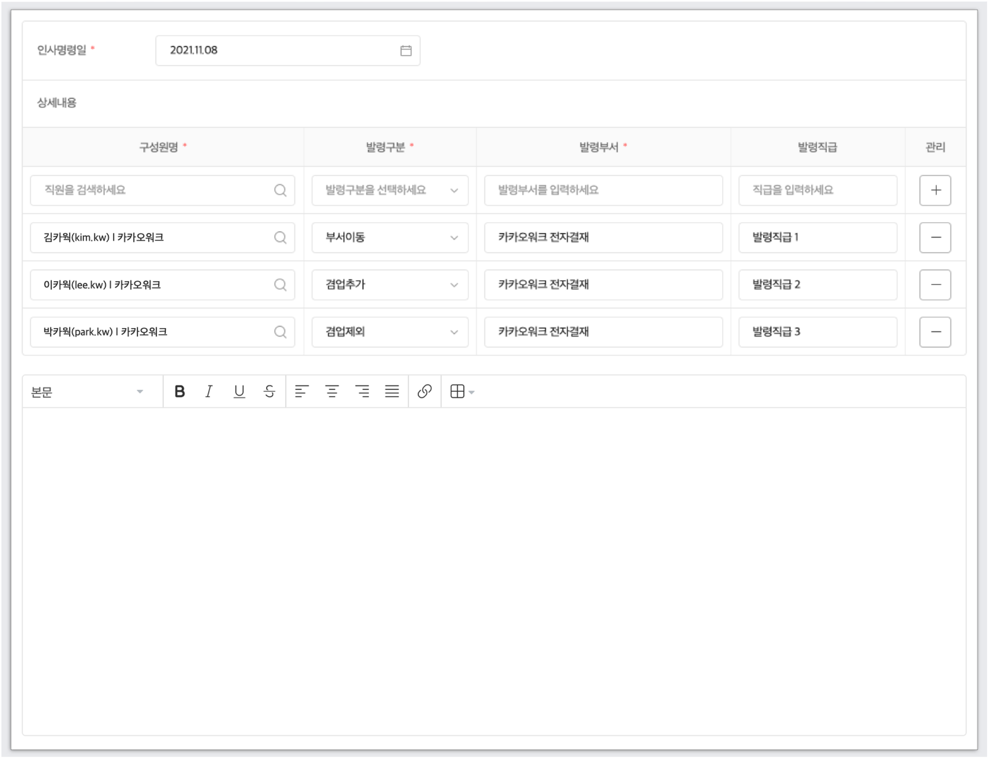 인사명령서 관련 폼이 제공되고 하단의 에디터 영역을 사용하여 기안 서식에 사용할 내용을 추가할 수 있습니다.