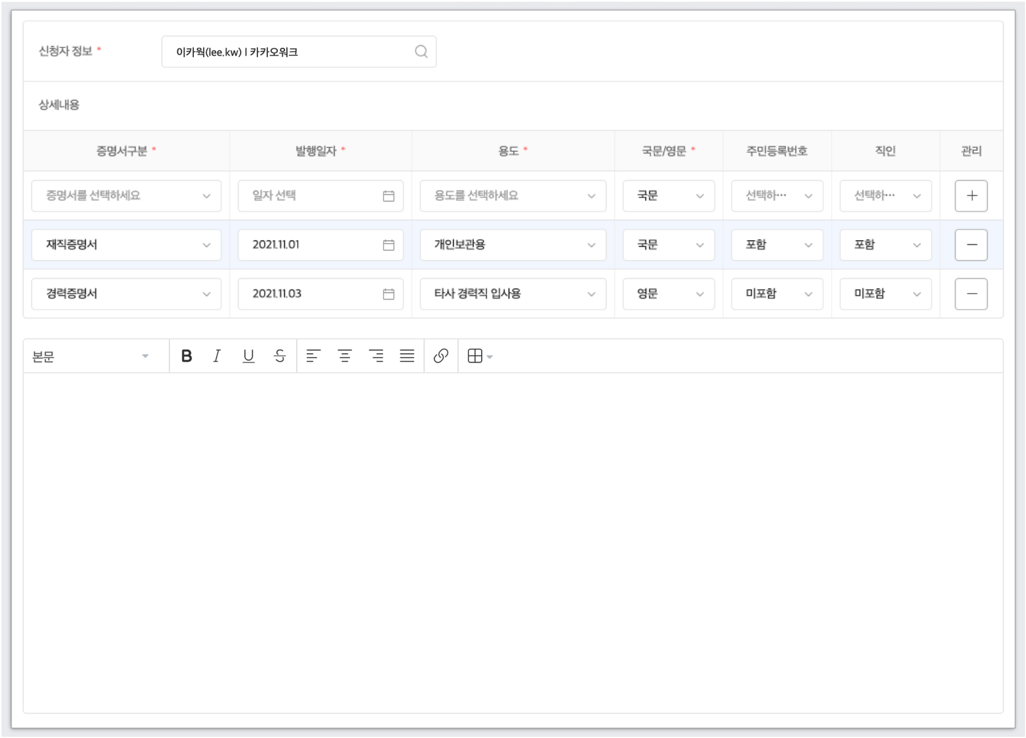 증명서신청서 관련 폼이 제공되고 하단의 에디터 영역을 사용하여 기안 서식에 사용할 내용을 추가할 수 있습니다.