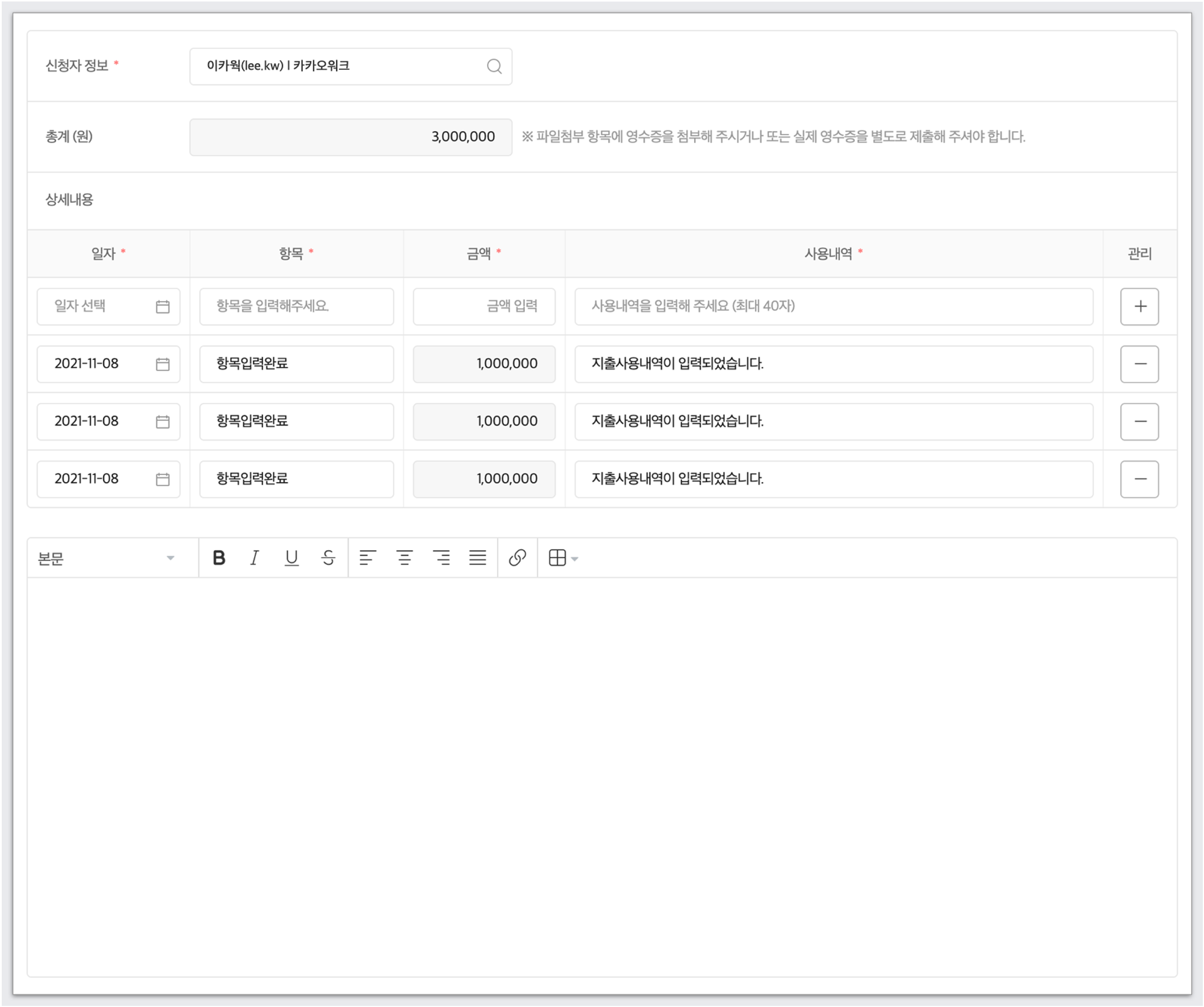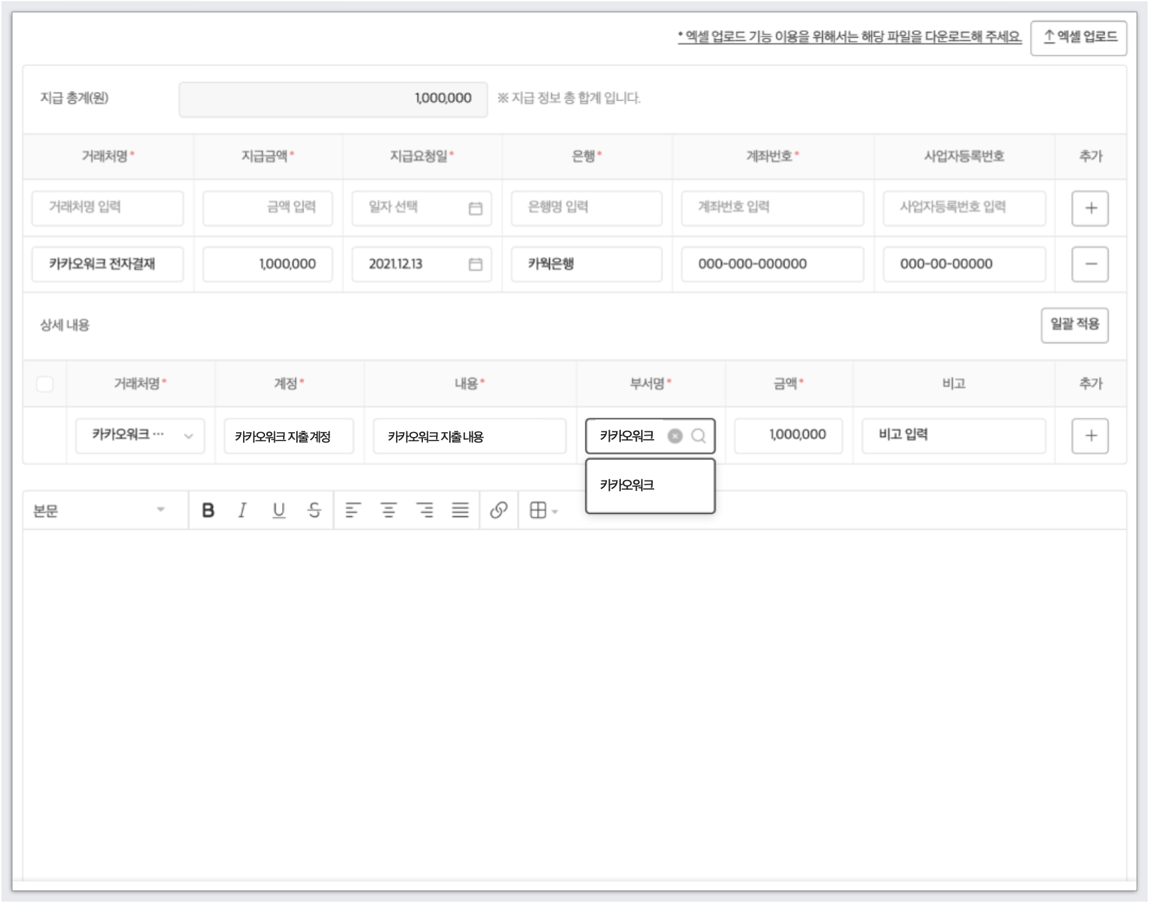* 지출결의서(엑셀업로드형) 관련 폼을 제공하며, 에디터 영역에서 기안 서식에 사용할 내용을 추가할 수 있습니다.