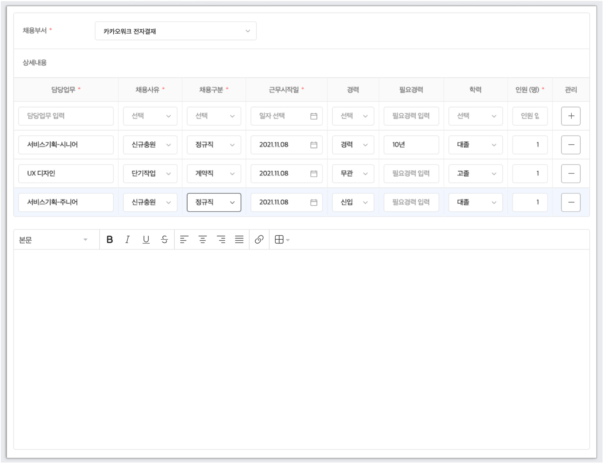채용계획서 관련 폼이 제공되고 하단의 에디터 영역을 사용하여 기안 서식에 사용할 내용을 추가할 수 있습니다.