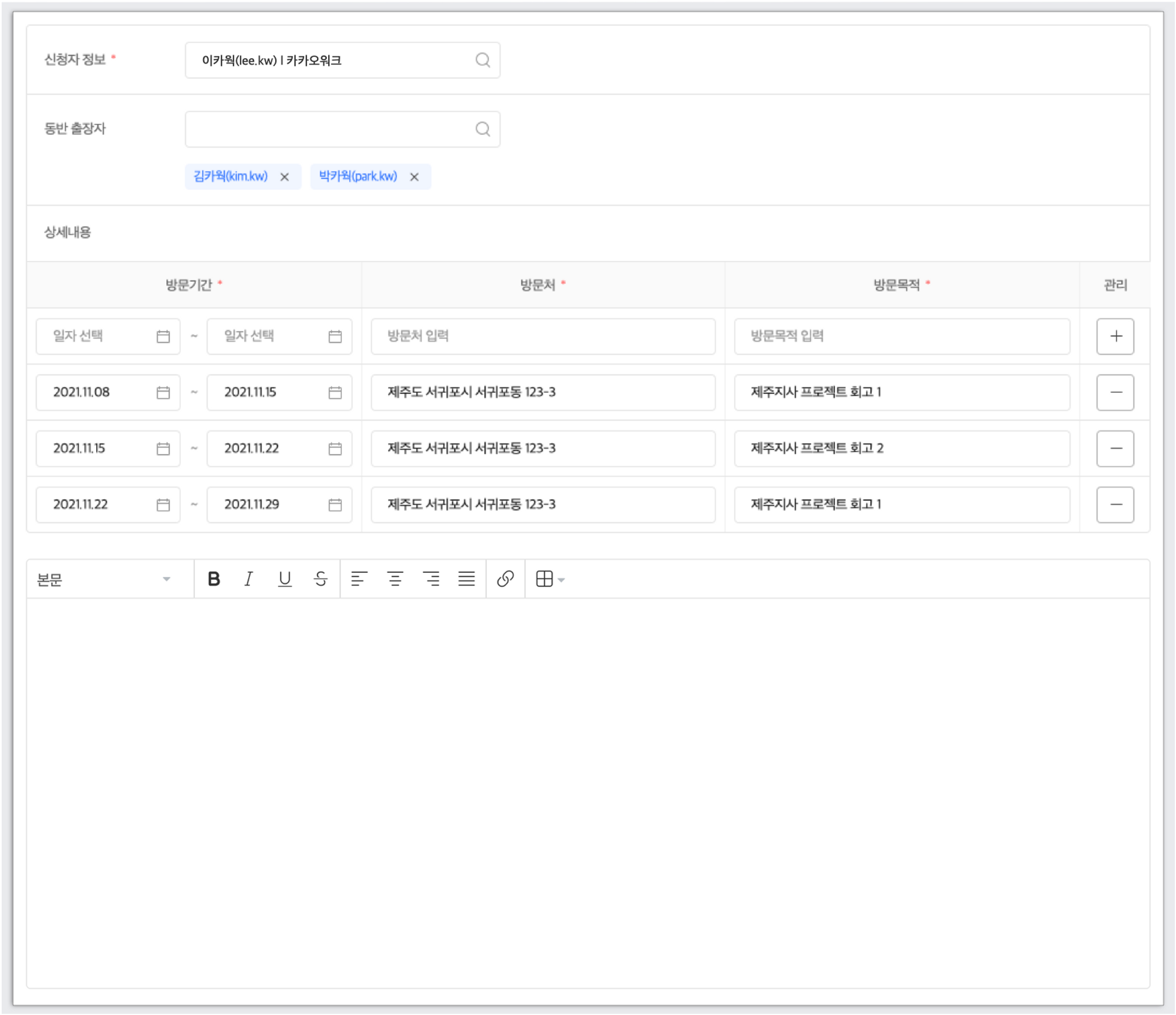 출장계획서 관련 폼이 제공되고 하단의 에디터 영역을 사용하여 기안 서식에 사용할 내용을 추가할 수 있습니다.