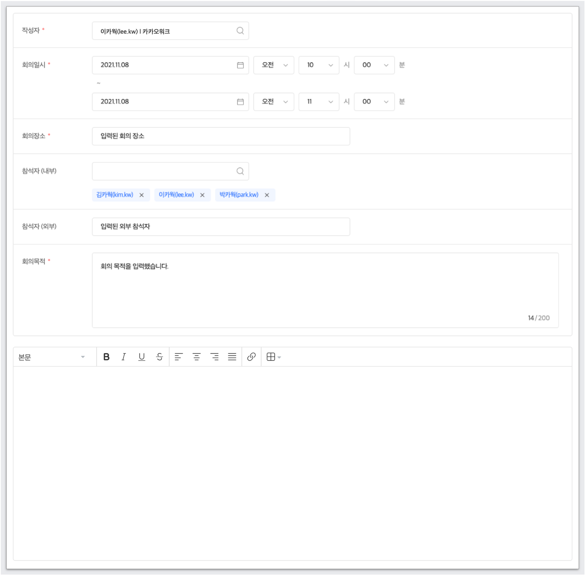회의록 관련 폼이 제공되고 하단의 에디터 영역을 사용하여 기안 서식에 사용할 내용을 추가할 수 있습니다.