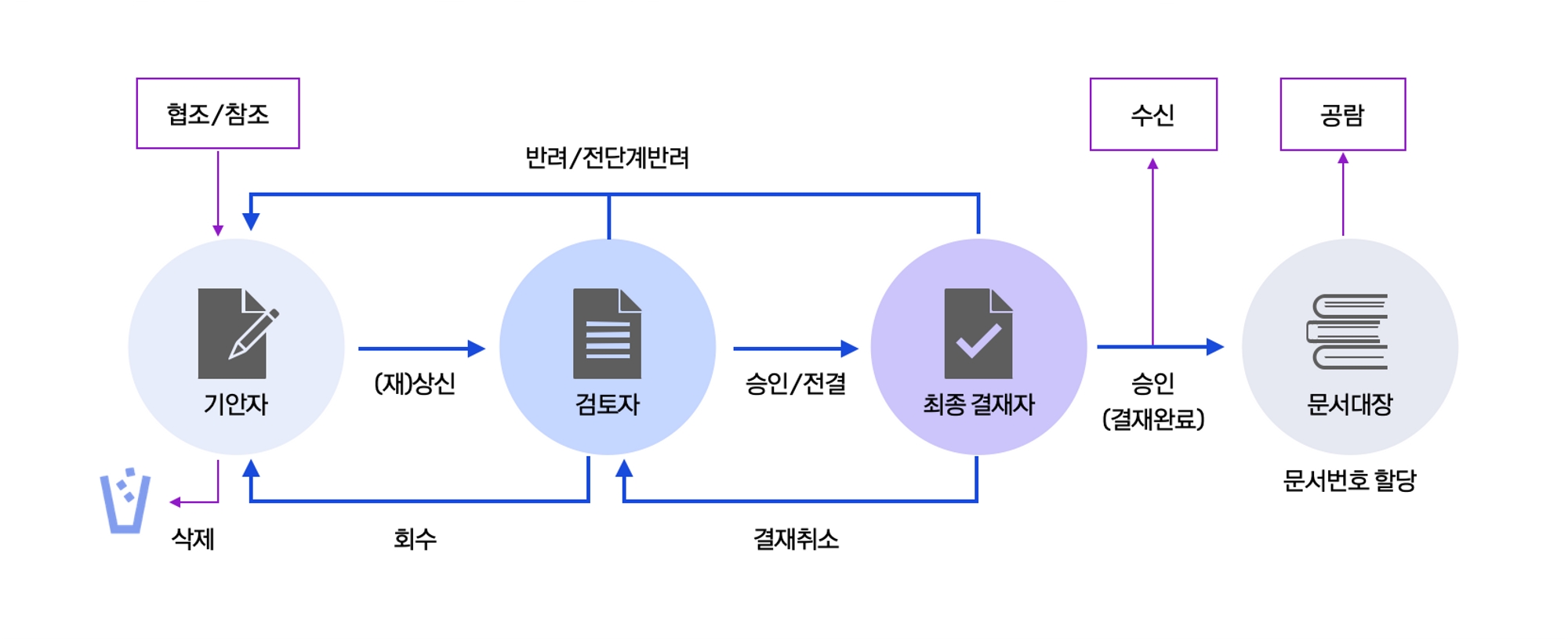 결재, 반려, 대결, 협조, 참조, 공람 등 일반적인 전자결재 프로세스 지원