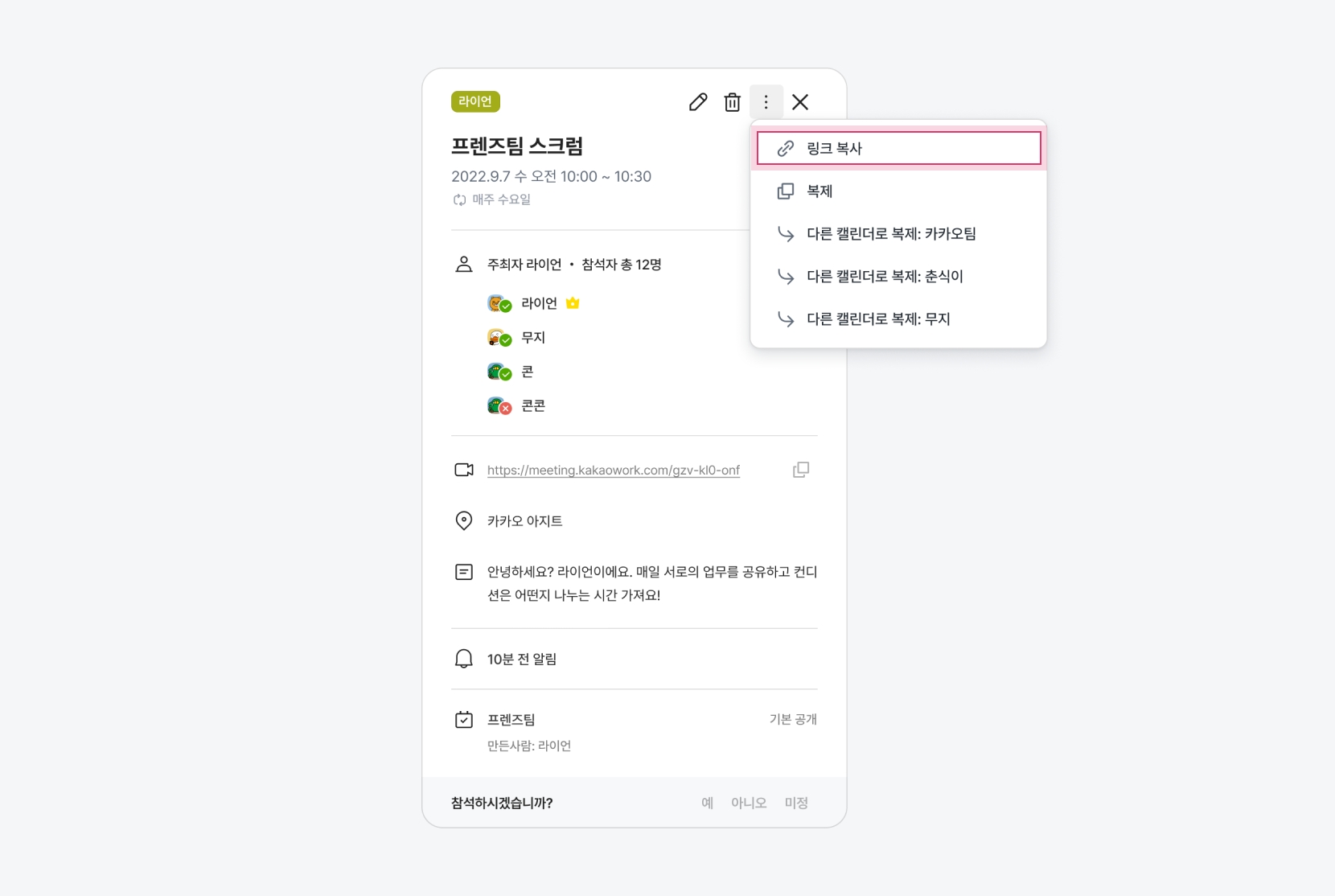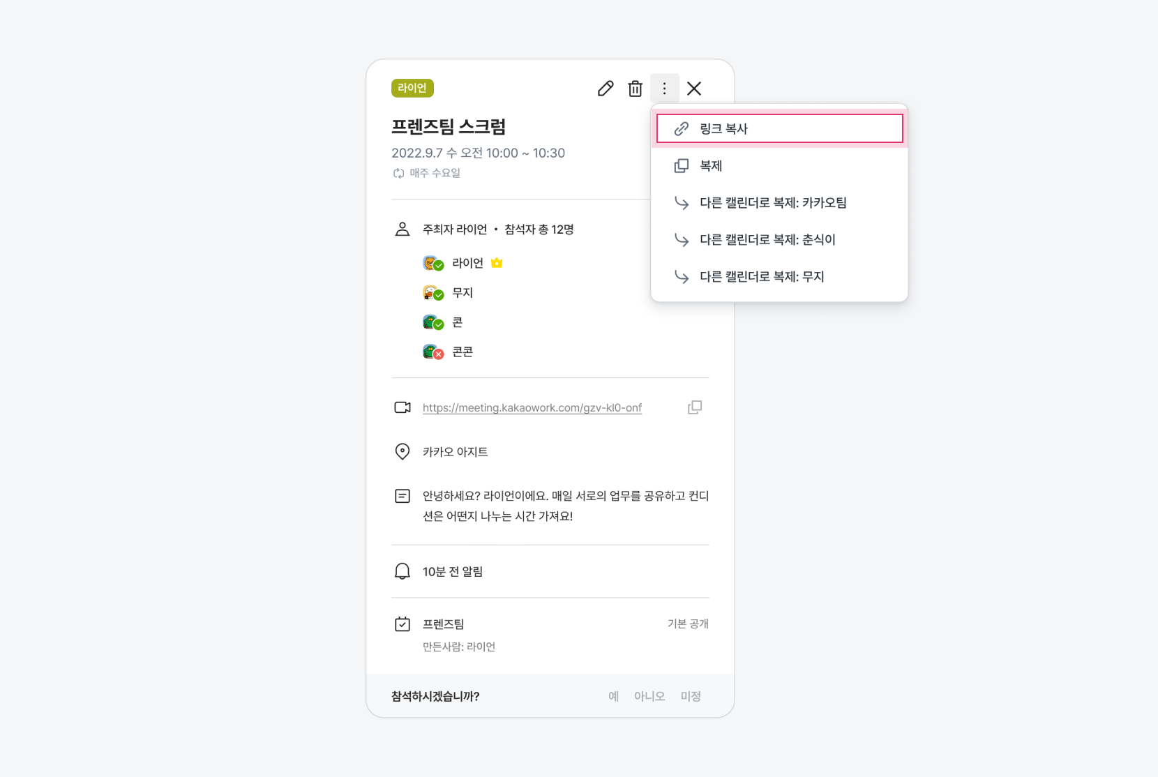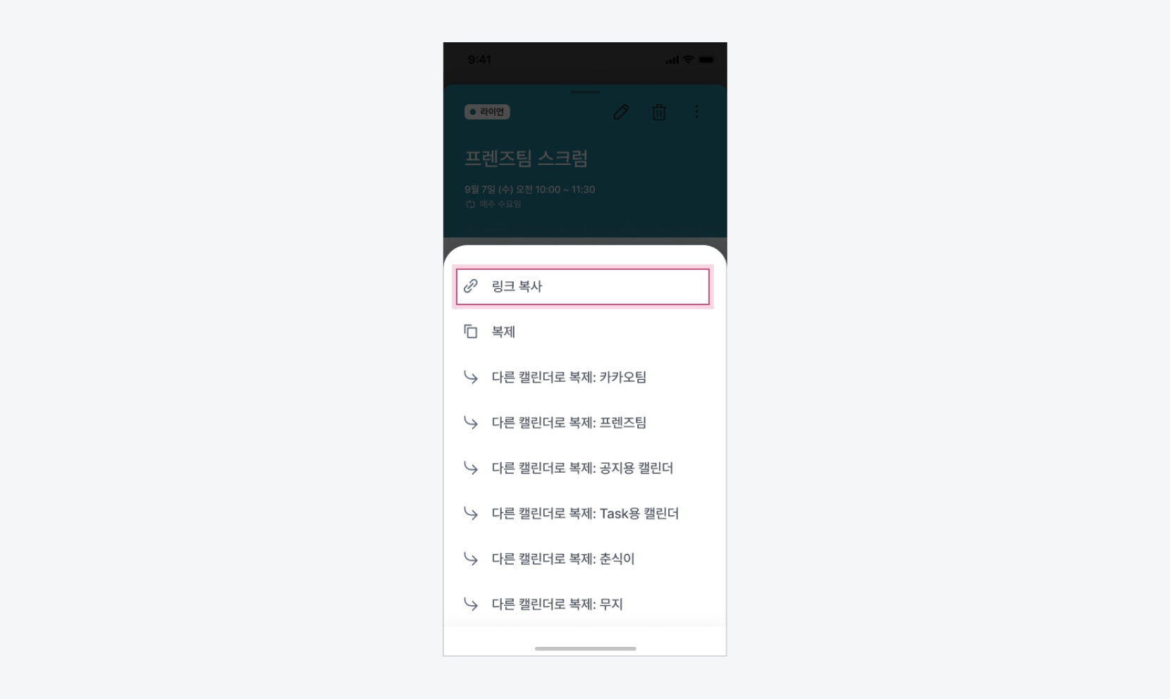 더보기(Mobile) 링크 복사 메뉴를 선택해 해당 일정의 링크를 동료/친구에게 전달합니다.