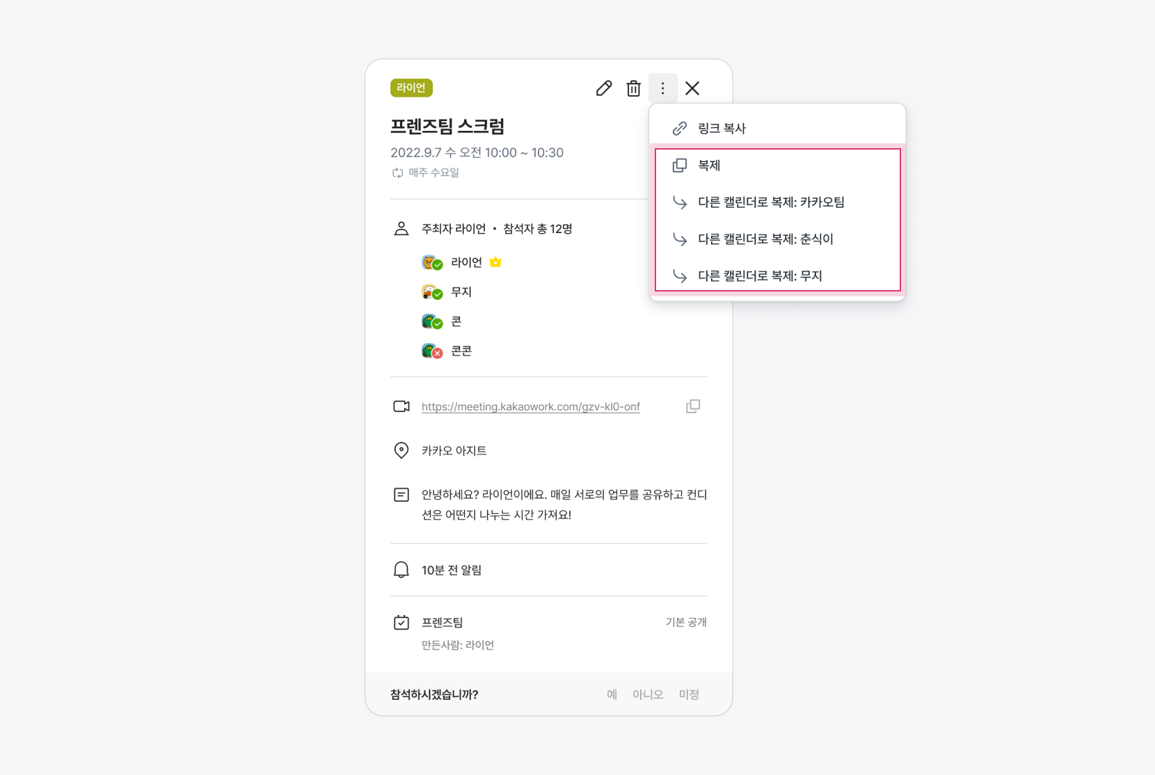 아이콘을 클릭합니다.복제 혹은 다른 캘린더로 복제 메뉴를 클릭하여, 해당 일정의 내용을 복제한 새 일정을 생성합니다.