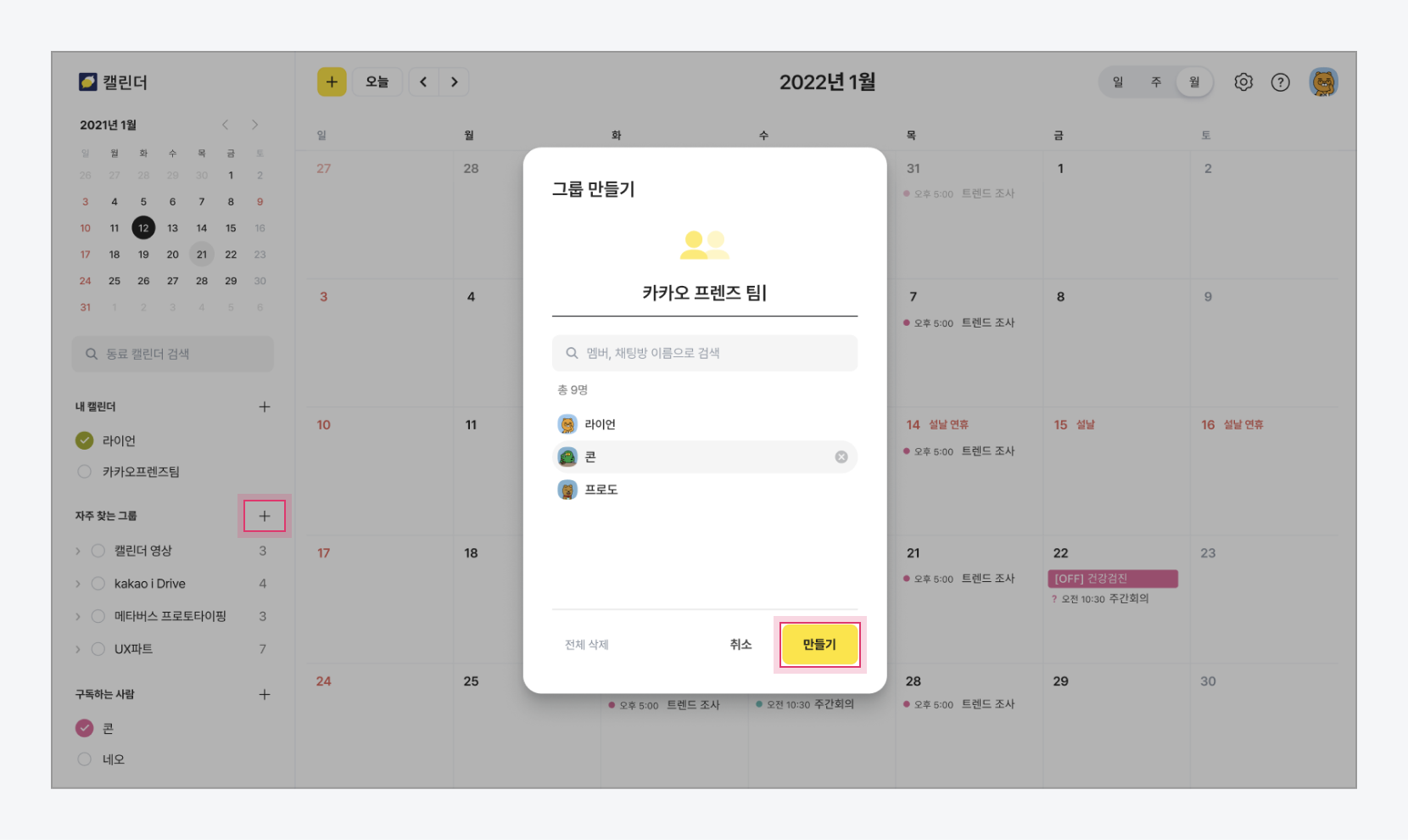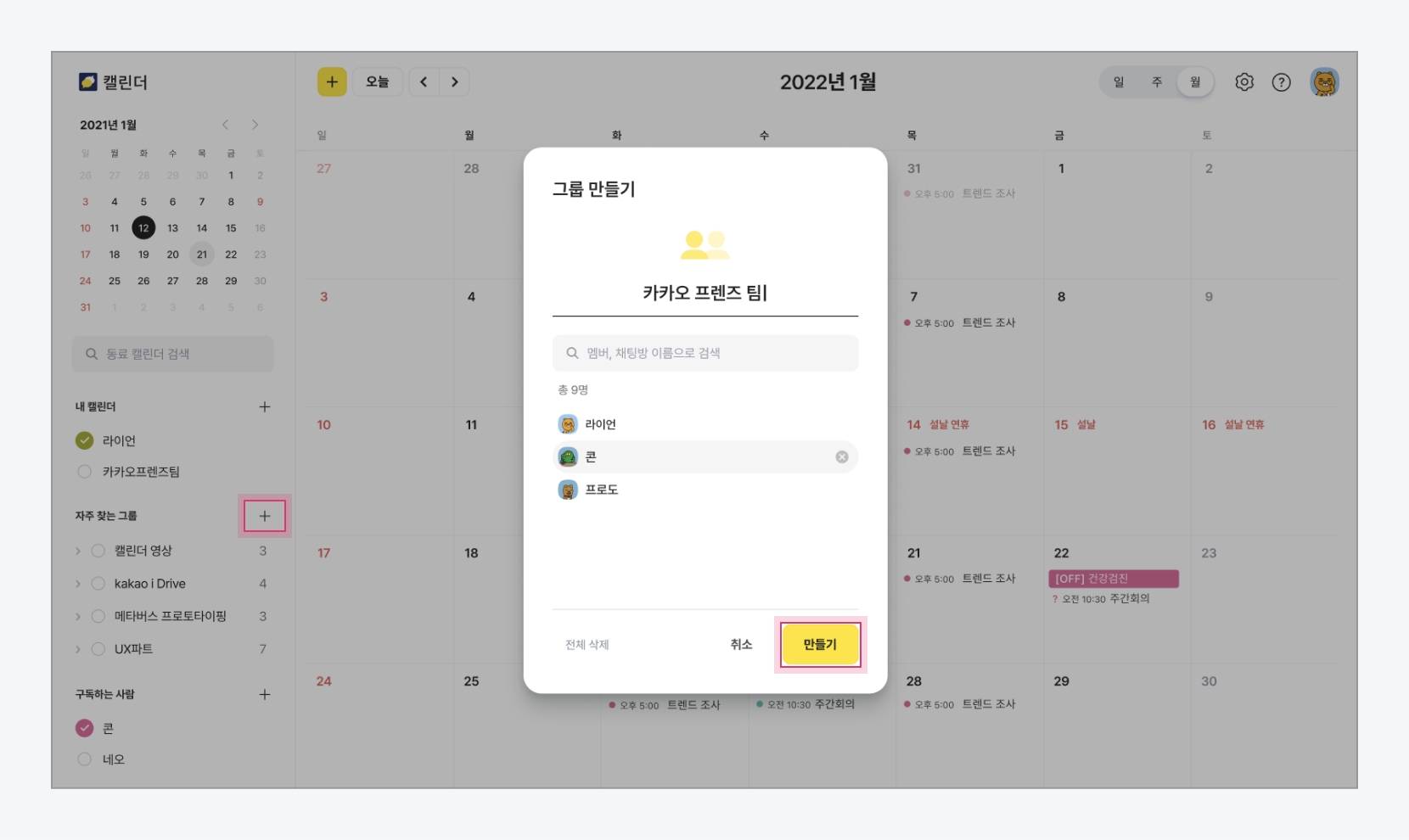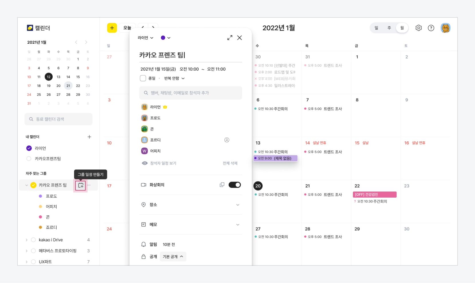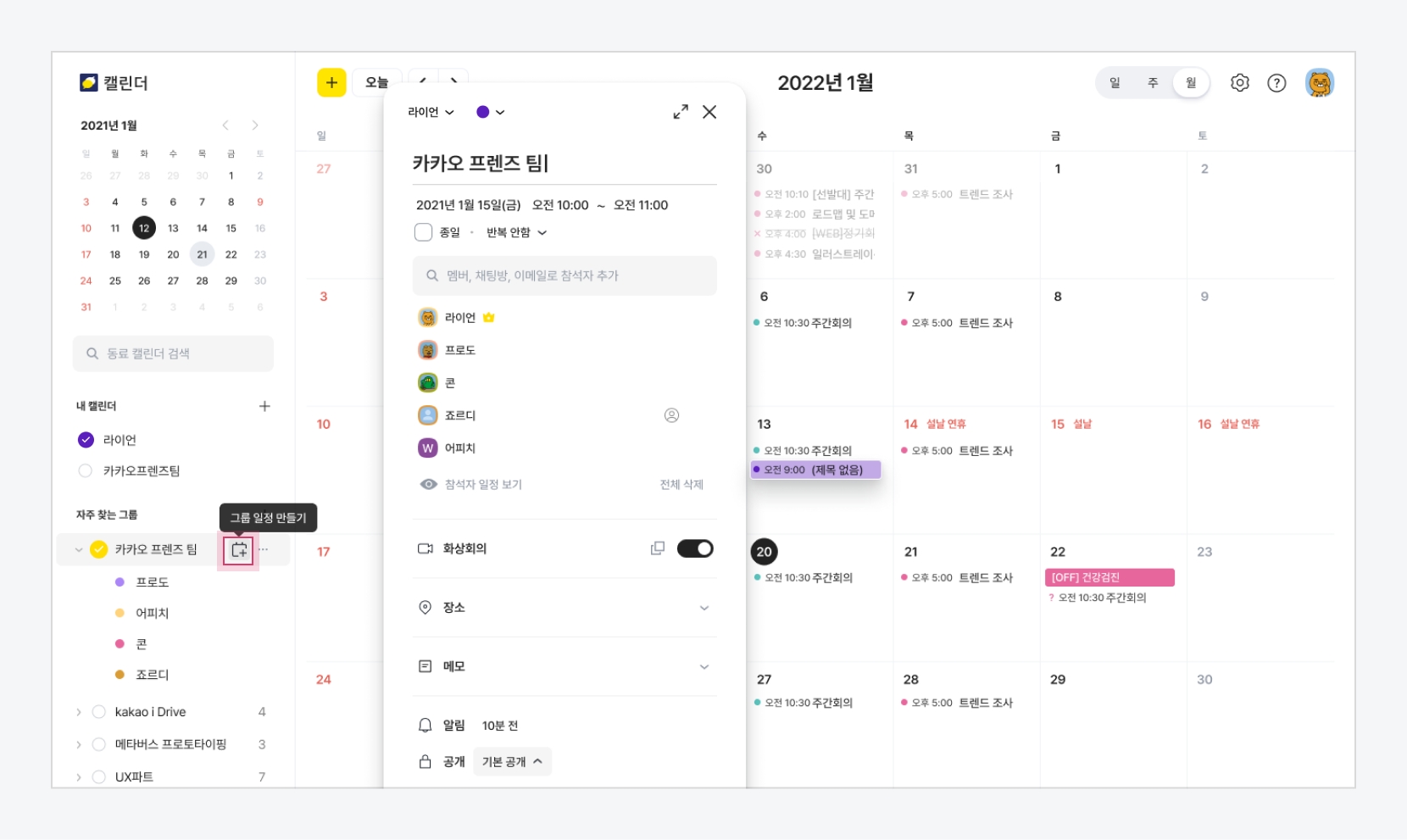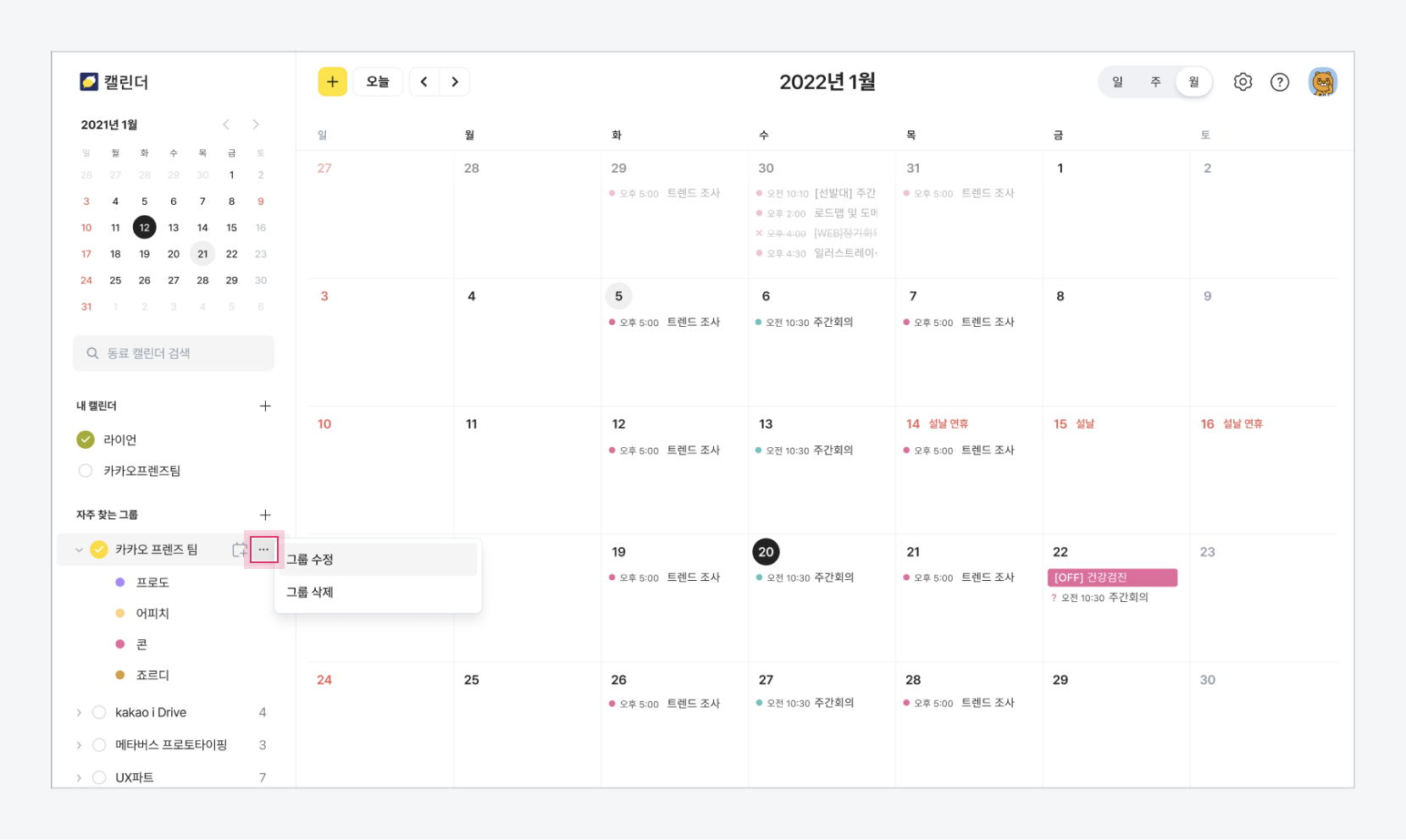 자주 일정을 함께하는 동료/친구들을 자주 찾는 그룹으로 설정하여 한 번에 일정을 확인하고, 함께하는 일정을 빠르게 생성할 수 있습니다.