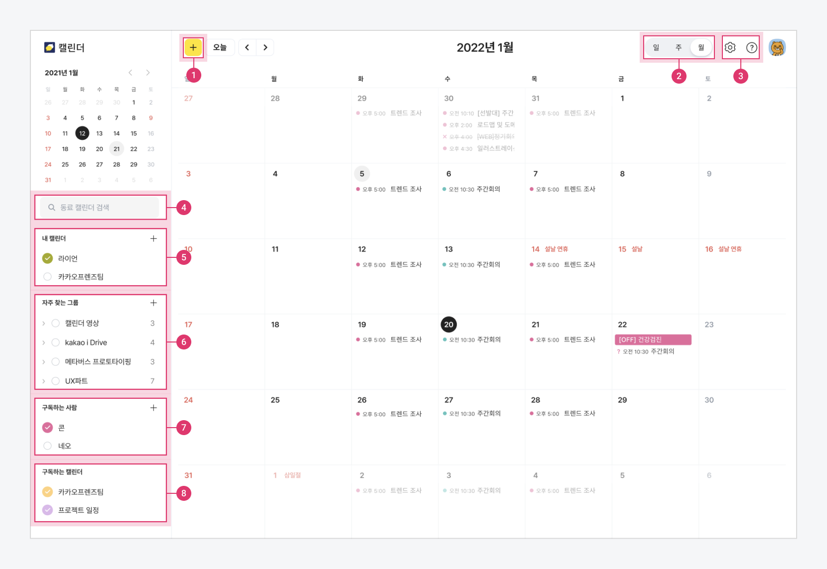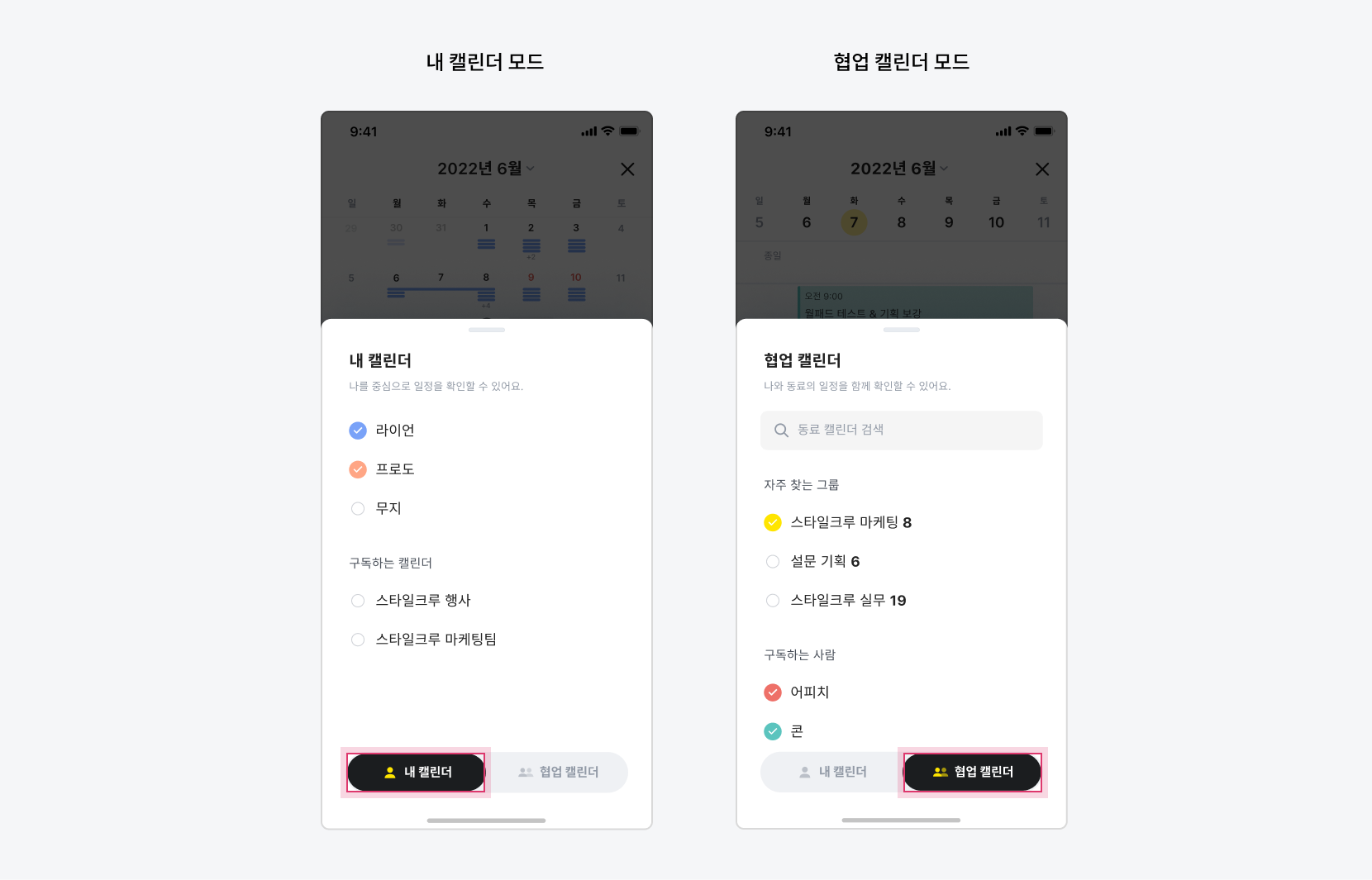 조회할 캘린더의 모드를 전환 - 내 캘린더 모드: 내 캘린더와 구독하는 캘린더 조회 - 협업 캘린더 모드: 자주 찾는 그룹, 구독하는 사람, 동료의 캘린더 조회