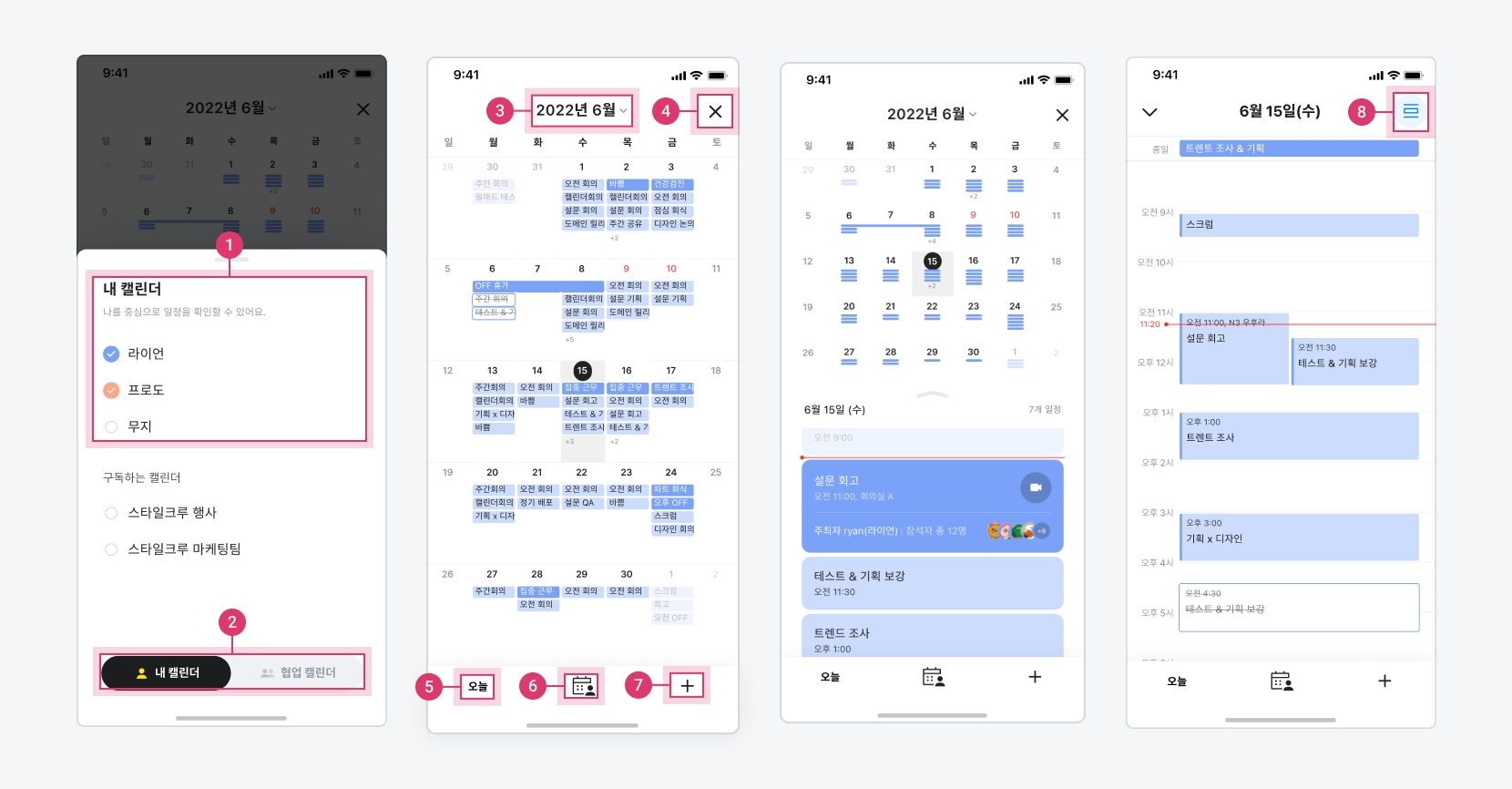 내 캘린더 모드에서는 내가 생성하거나 공유받은 캘린더의 일정을 확인할 수 있습니다.