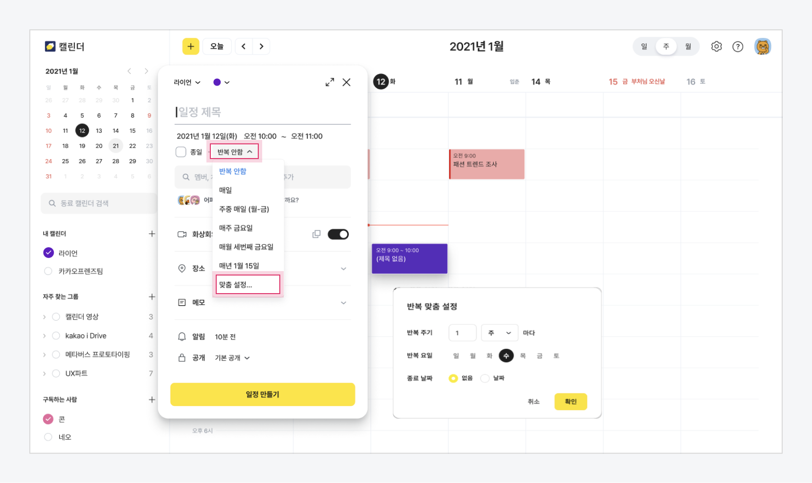 반복 옵션을 선택하면 특정 주기로 반복되는 일정을 생성할 수 있습니다. 맞춤 설정을 클릭하여 자유롭게 반복 주기를 설정할 수 있습니다.