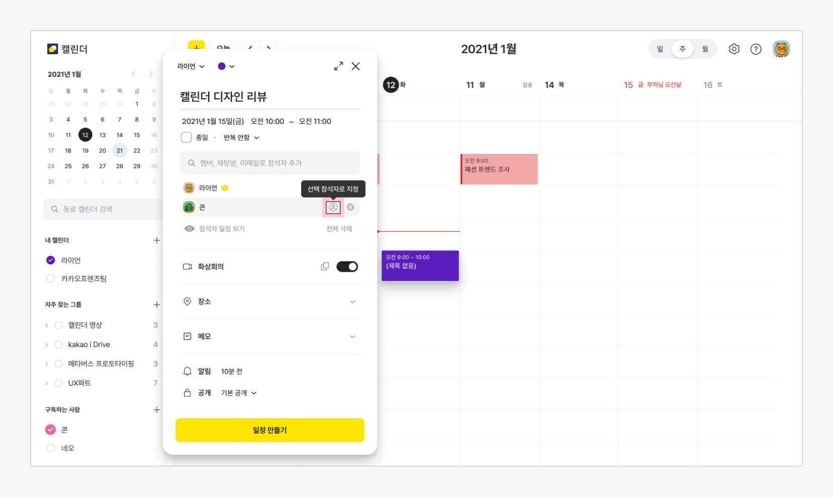 초대할 멤버를 선택하면 해당 멤버의 일정이 캘린더에 나타나며, 나와 멤버의 일정에서 공통으로 빈 시간을 찾아 일정을 생성할 수 있습니다.