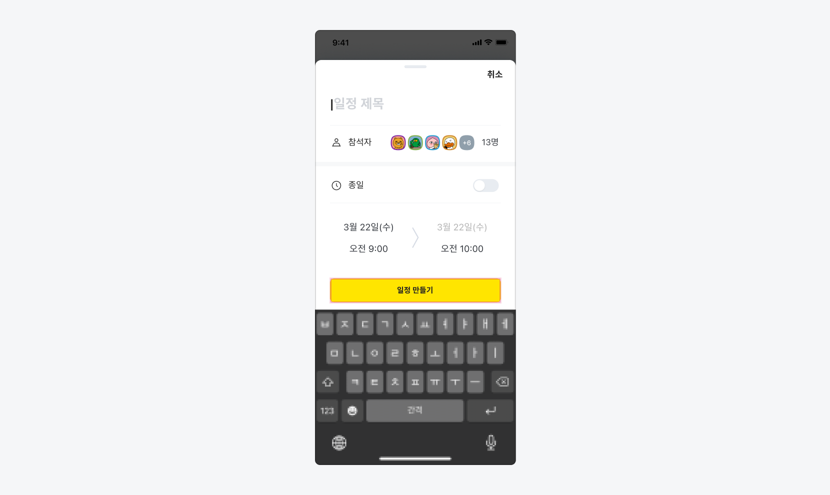 일정 생성(Mobile) 일정 생성 팝업창에서 일정 제목과 날짜/시간을 입력합니다.