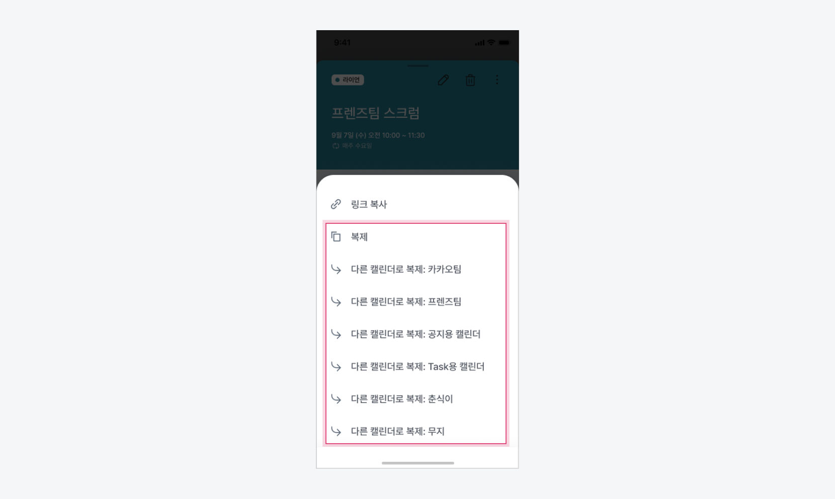 더보기(Mobile) 복제 혹은 다른 캘린더로 복제 메뉴를 선택하여, 해당 일정의 내용을 복제한 새 일정을 생성합니다.