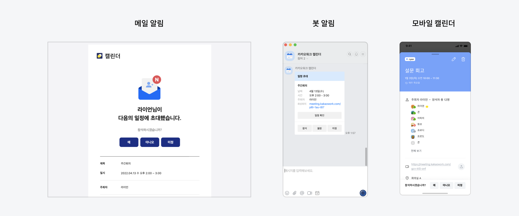일정 세부 내용(PC) 일정 생성이 완료되면, 참석자들에게 일정 초대 이메일과 카카오워크 알림이 발송됩니다.