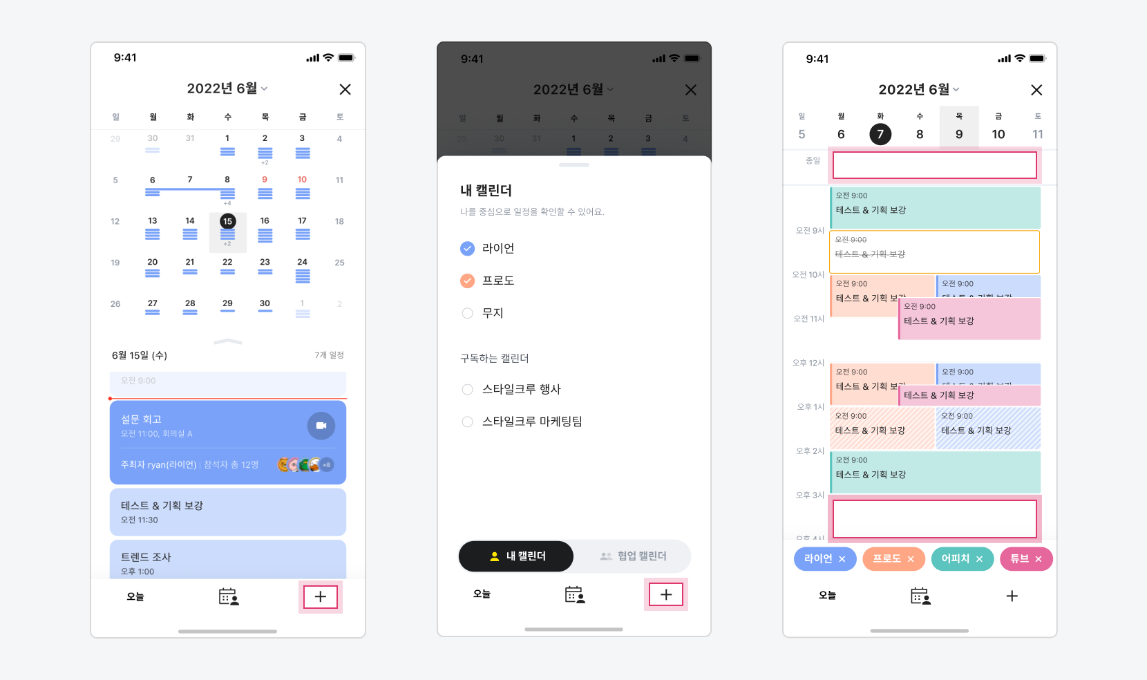 구독한 다른 멤버(동료/친구)의 캘린더 목록 - 모바일 버전에서는 리스트 조회만 가능 - 구독하는 사람, 구독하는 캘린더의 설정 및 관리는 PC 버전에서 수행