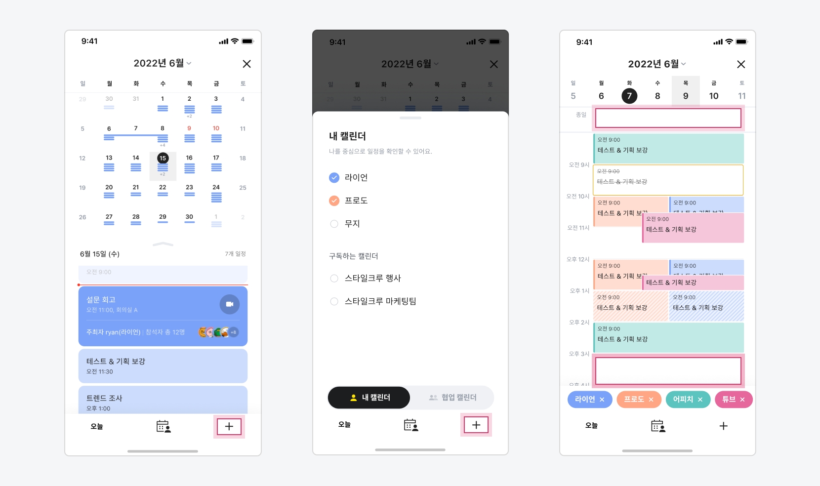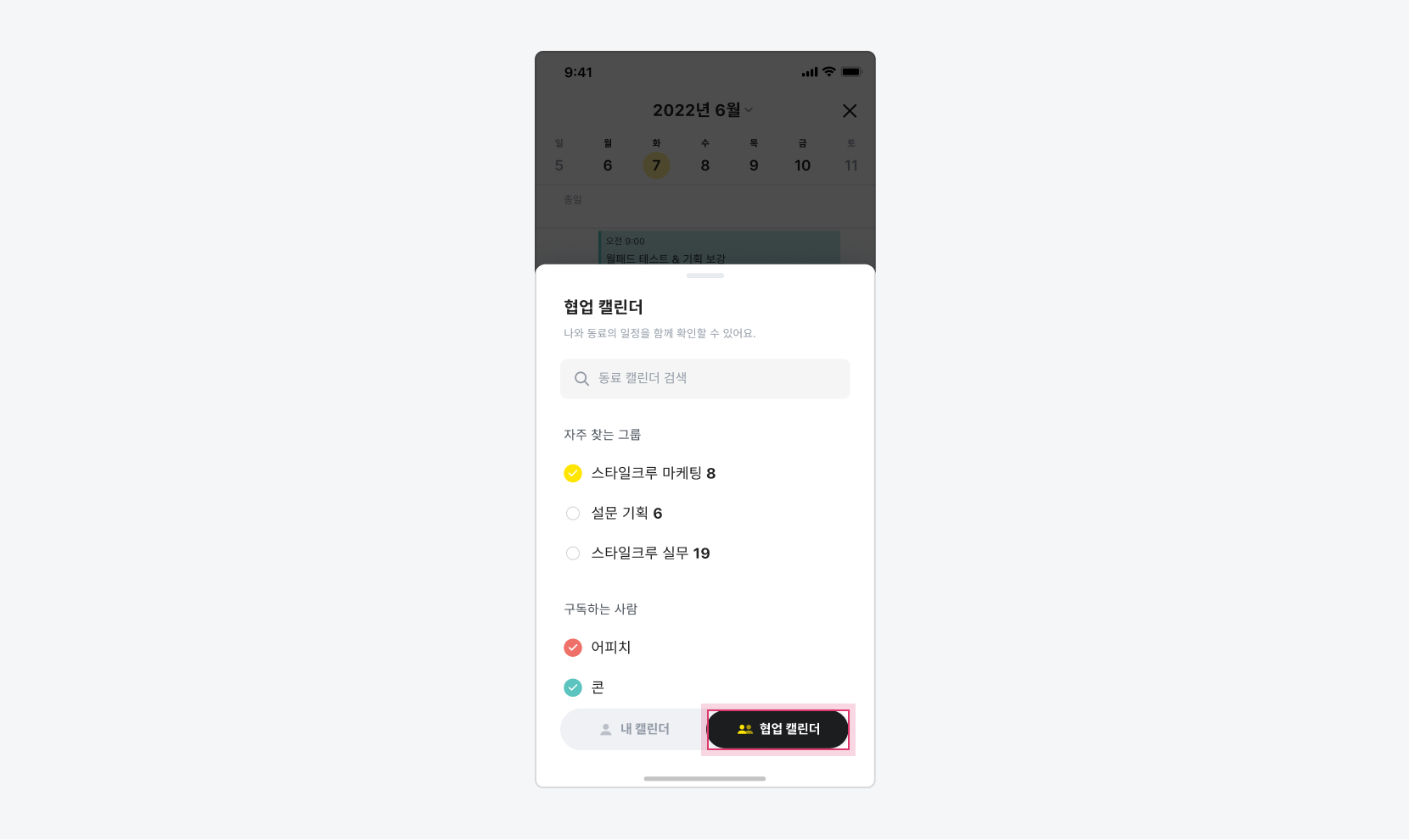 캘린더 선택 메뉴에서 협업 캘린더 모드를 선택합니다.